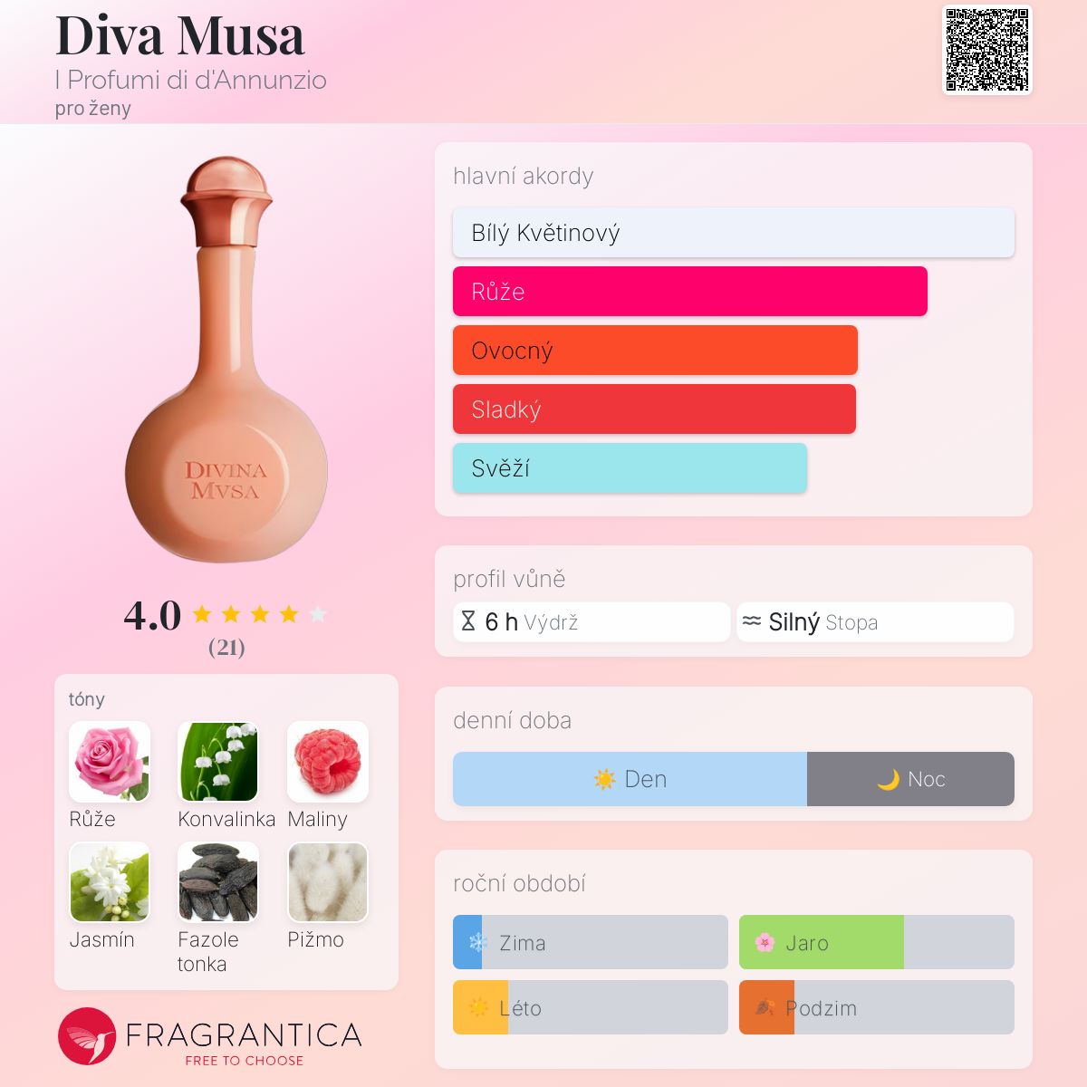 Diva Musa podle I Profumi di d'Annunzio je Orientální Floral vůně pro ženy. Diva Musa byl/a uveden/a v roce 2017. Vrchní tóny jsou Malinový list a Bergamot; střední tóny jsouRůže, Konvalinka a Jasmín ; základní tóny jsou Fazole tonka, Pižmo, Jantar (ambra), Vanilka a Bílé dřevo.