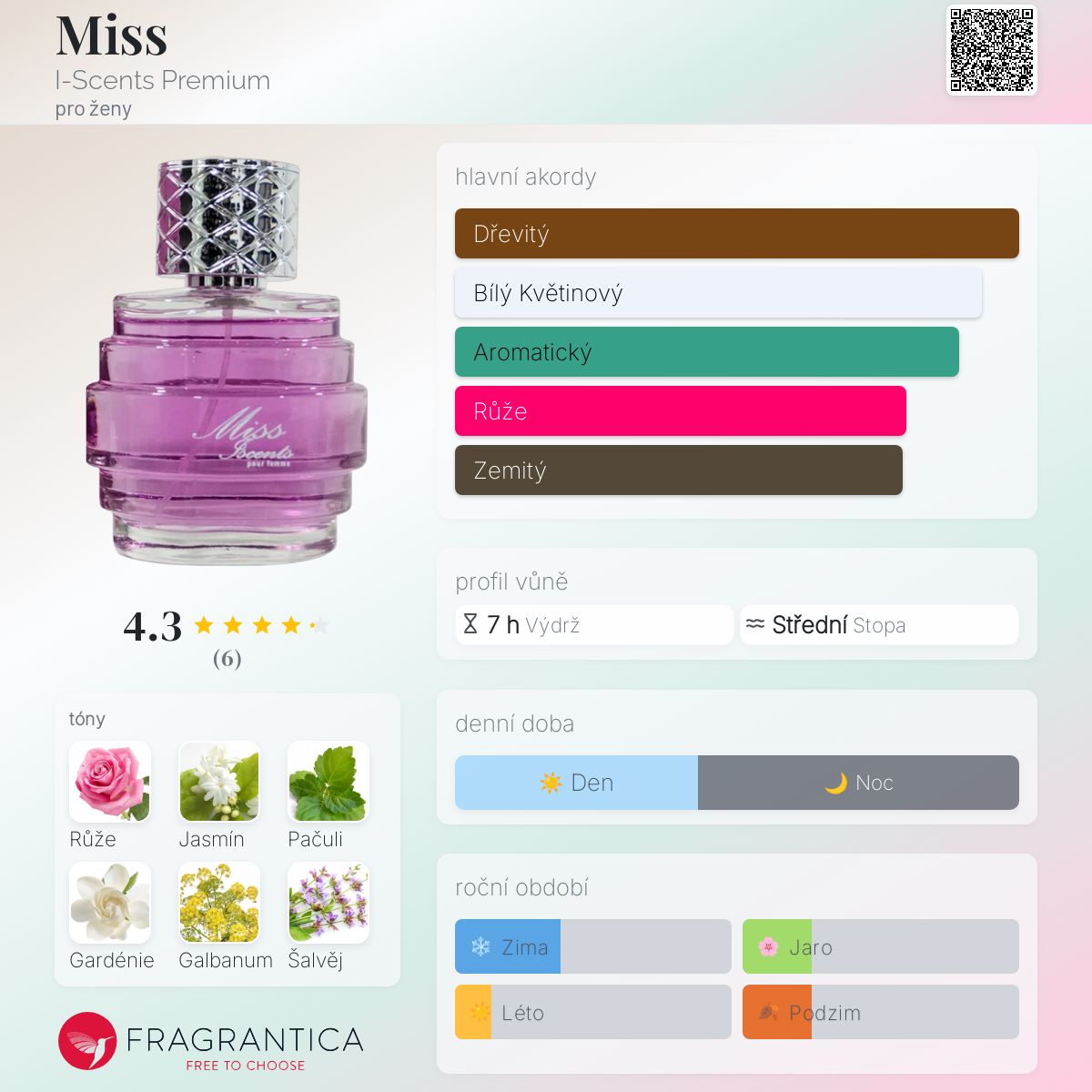 Miss podle I-Scents Premium je Woody vůně pro ženy. Miss byl/a uveden/a v roce 2017. Vrchní tóny jsou Gardénie, Galbanum a Šalvěj; střední tóny jsouRůže, Jasmín, Karafiát a Narcis ; základní tóny jsou Pačuli, Kůže, Santalové dřevo, Dubový mech, Vetiver a Jantar (ambra).