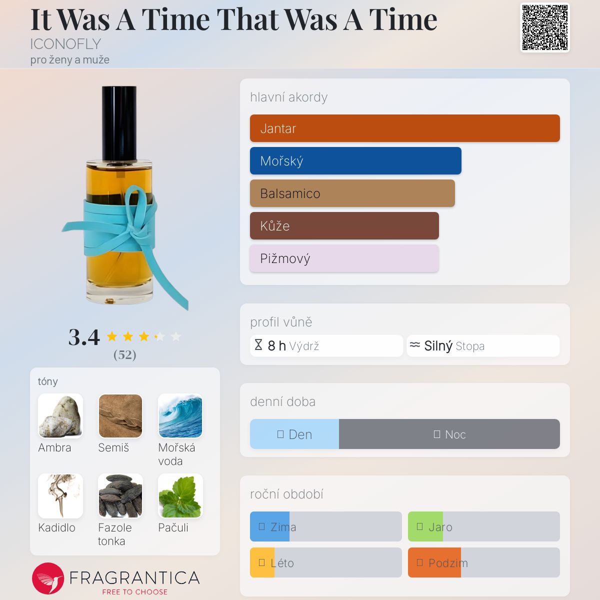 It Was A Time That Was A Time podle ICONOFLY je Orientální Woody vůně pro ženy a muže. It Was A Time That Was A Time byl/a uveden/a v roce 2015. "Nosem" za touto vůní je Nicolas Bonneville. Vrchní tóny jsou Ambra a Mořské tóny; střední tóny jsouSemiš, Fazole tonka, Pačuli a Fialka ; základní tóny jsou Kadidlo a Pižmo.