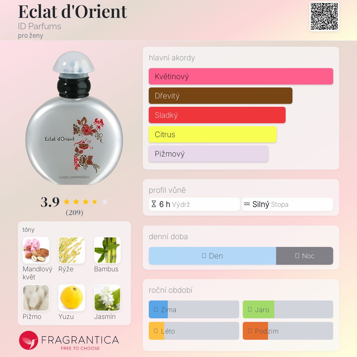 Eclat d'Orient podle ID Parfums je Floral Aldehyde vůně pro ženy. Eclat d'Orient byl/a uveden/a v roce 2009. "Nosem" za touto vůní je Karine Dubreuil-Sereni. Vrchní tóny jsou Yuzu, Frézie a Bergamot; střední tóny jsouMandlový květ , Rýže, Bambus a Divoký jasmín ; základní tóny jsou Bílé pižmo a Santalové dřevo.