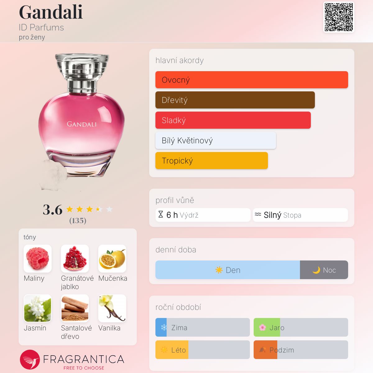 Gandali podle ID Parfums je Floral Fruity vůně pro ženy. Gandali byl/a uveden/a v roce 2009. "Nosem" za touto vůní je Emilie Bouge. Vrchní tóny jsou Maliny, Granátové jablko a Mučenka; střední tón jeJasmín ; základní tóny jsou Santalové dřevo, Vanilka a Pačuli.