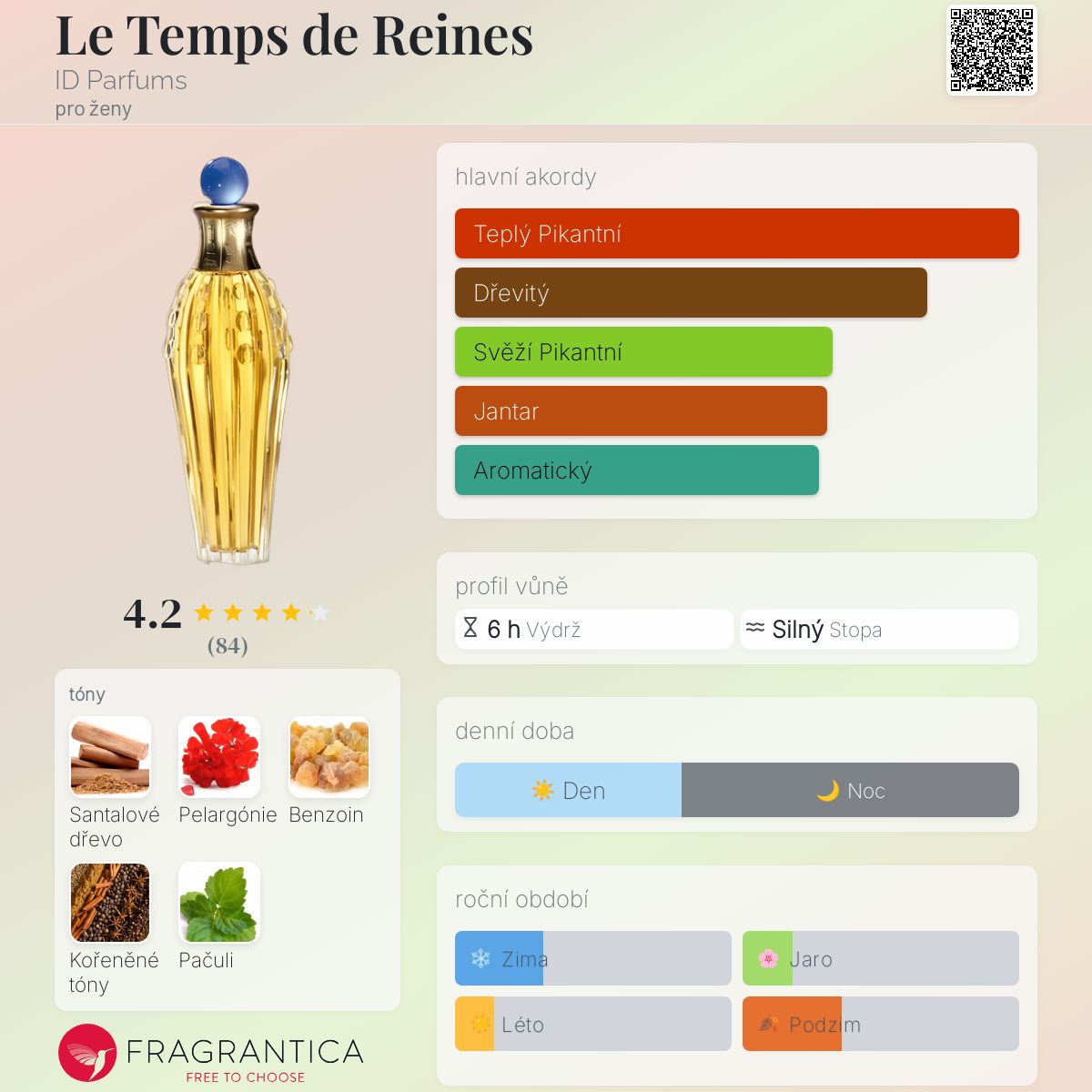 Le Temps de Reines podle ID Parfums je Orientální Woody vůně pro ženy. Le Temps de Reines byl/a uveden/a v roce 1998. "Nosem" za touto vůní je Christopher Sheldrake. Vrchní tóny jsou Pelargónie a Koření; střední tón jePačuli ; základní tóny jsou Santalové dřevo a Benzoin.