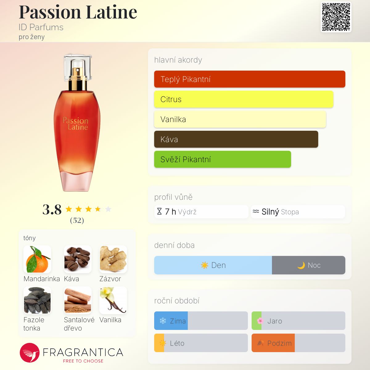 Passion Latine podle ID Parfums je Citrus Gourmand vůně pro ženy. Passion Latine byl/a uveden/a v roce 2018. "Nosem" za touto vůní je Vincent Ricord. Vrchní tóny jsou Mandarinka a Zázvor; střední tóny jsouKáva, Vanilkový květ a Jasmín Sambac ; základní tóny jsou Fazole tonka, Santalové dřevo a Kakao.