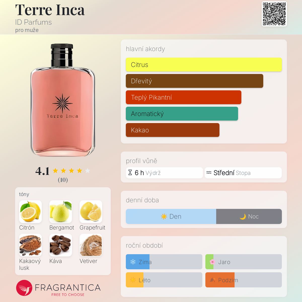 Terre Inca podle ID Parfums je Woody Spicy vůně pro muže. Terre Inca byl/a uveden/a v roce 2017. "Nosem" za touto vůní je Vincent Ricord. Vrchní tóny jsou Citrón, Bergamot a Grapefruit; střední tóny jsouKakao a Káva ; základní tóny jsou Vetiver, Pačuli a Cedr.