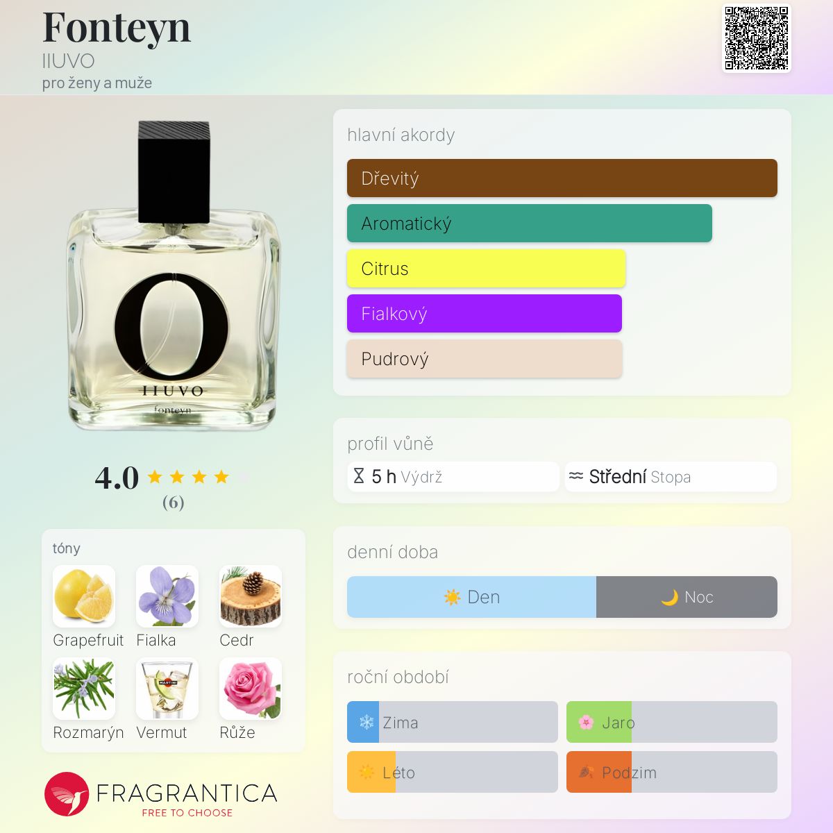 Fonteyn podle IIUVO je Orientální Spicy vůně pro ženy a muže. Fonteyn byl/a uveden/a v roce 2017. Fonteyn byl/a vytvořen/a Leo Gibbon a Tomi Ahmed. Vrchní tóny jsou Grapefruit, Rozmarýn, Vermut a Kardamom; střední tóny jsouFialka, Růže, Černý rybíz, Poupata rybízu a Frézie ; základní tóny jsou Virginský cedr, Papyrus, Mech, Vanilka, Vetiver a Pačuli.