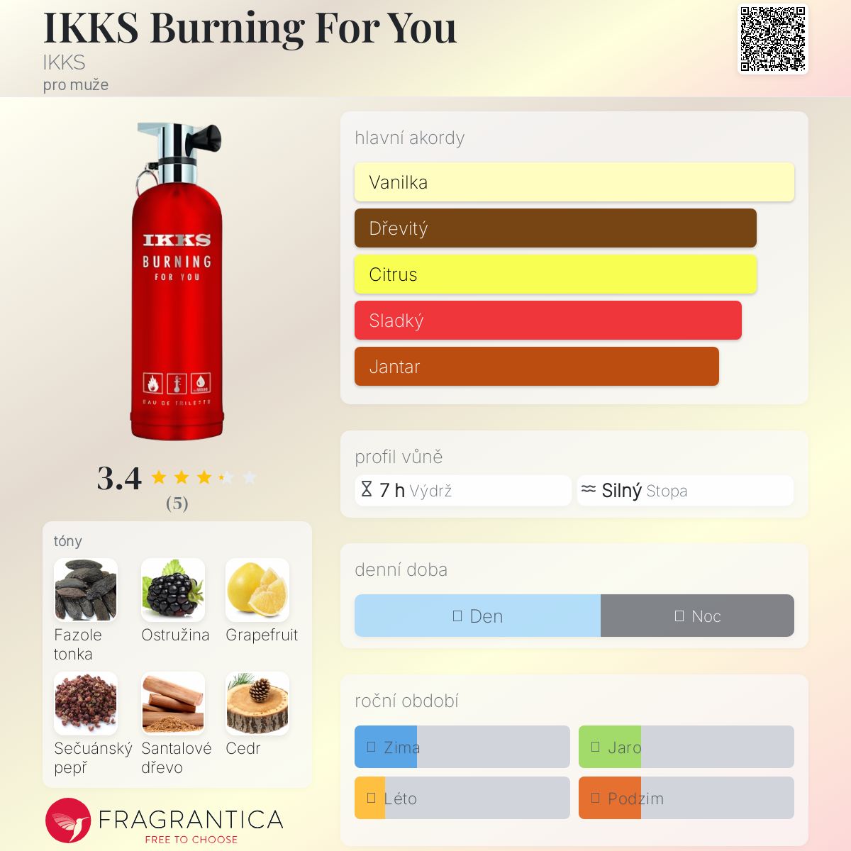 IKKS Burning For You podle IKKS je Woody Aromatic vůně pro muže. IKKS Burning For You byl/a uveden/a v roce 2015. Vrchní tóny jsou Ostružina, Grapefruit a Sečuánský pepř; střední tóny jsouAtlasový cedr, Šalvěj muškátová a Šafrán ; základní tóny jsou Fazole tonka, Santalové dřevo a Kůže.