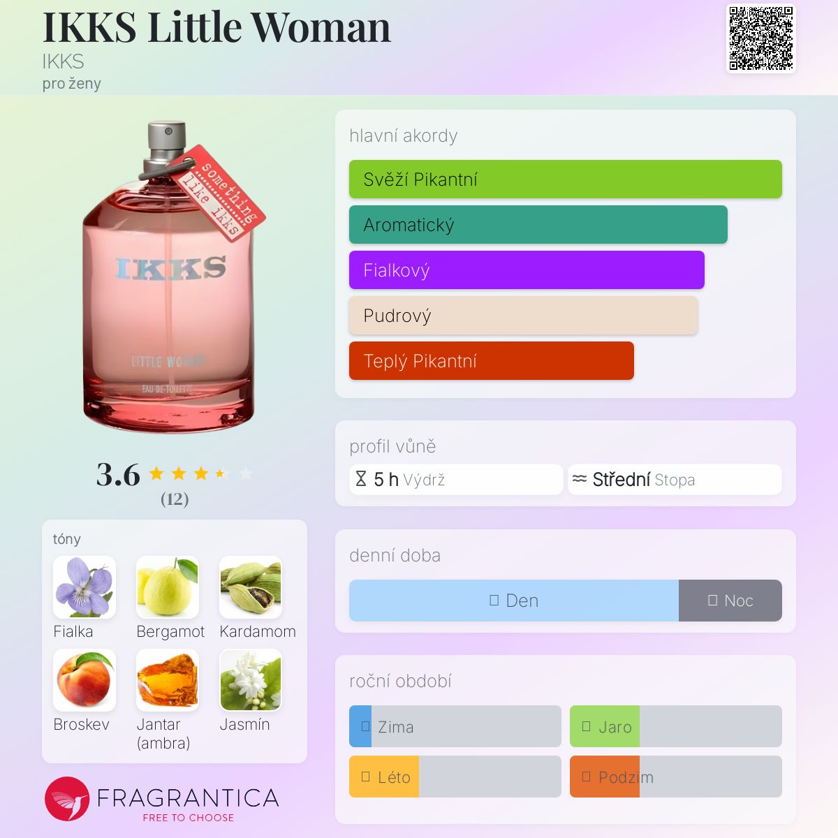 IKKS Little Woman podle IKKS je Floral vůně pro ženy. IKKS Little Woman byl/a uveden/a v roce 2000. Vrchní tóny jsou Bergamot, Kardamom a Levandule; střední tóny jsouFialka, Broskev a Konvalinka ; základní tóny jsou Jantar (ambra), Jasmín a Fazole tonka.