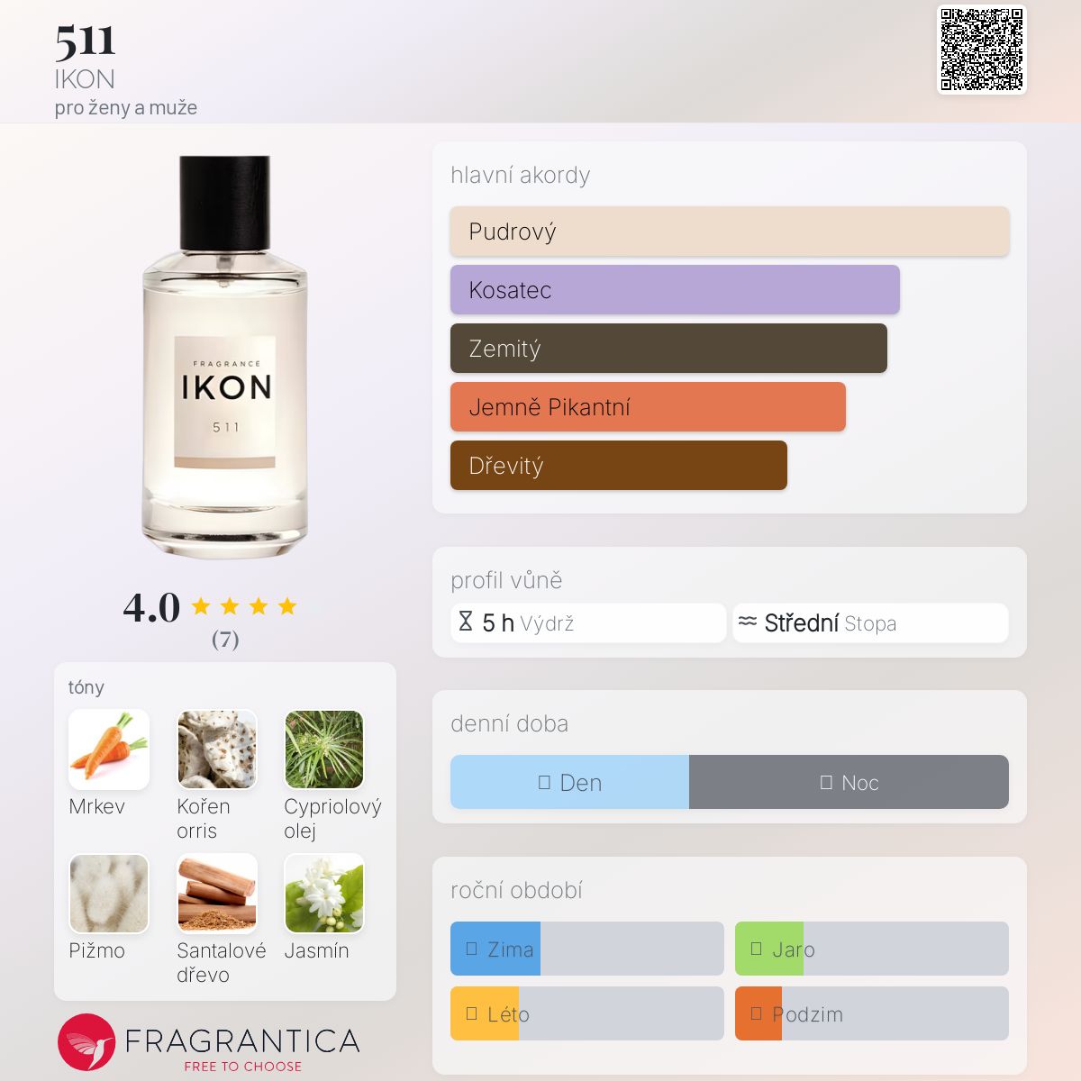 511 podle IKON je Orientální Floral vůně pro ženy a muže. 511 byl/a uveden/a v roce 2020. Vrchní tóny jsou Mrkev, Kardamom a Pryskyřice elimi; střední tóny jsouOrris, Jasmín a Konvalinka ; základní tóny jsou Cypriolový olej, Pižmo, Australské santalové dřevo a Jantar (ambra).