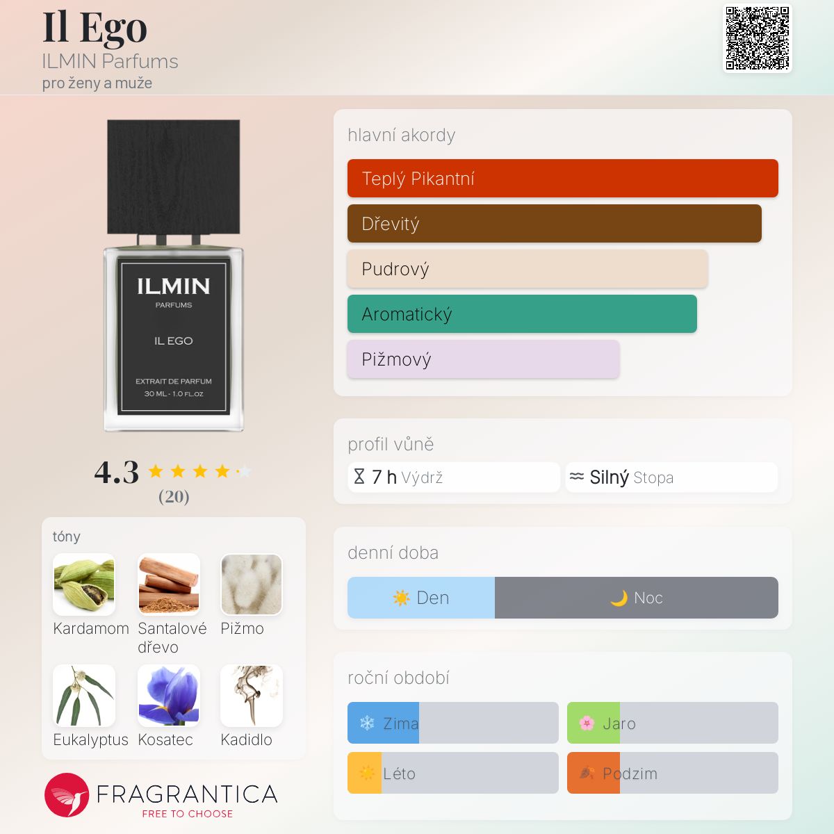 Il Ego podle ILMIN Parfums je Woody Spicy vůně pro ženy a muže. Il Ego byl/a uveden/a v roce 2019. Vrchní tóny jsou Kardamom, Eukalyptus a Bergamot; střední tóny jsouKosatec, Kadidlo, Fialka a Jantar (ambra) ; základní tóny jsou Santalové dřevo, Pižmo, Vetiver a Tabák.