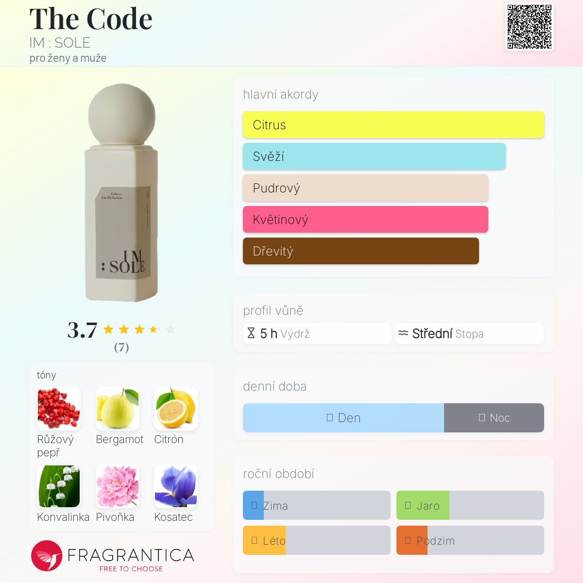 The Code podle IM : SOLE je vůně pro ženy a muže. Vrchní tóny jsou Růžový pepř, Bergamot a Citrón; střední tóny jsouKonvalinka, Pivoňka a Kosatec ; základní tóny jsou Ambra, Cedr a Pižmo.