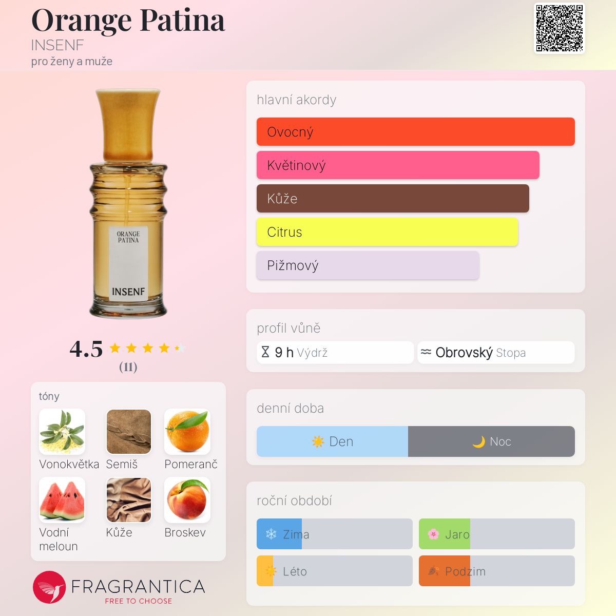 Orange Patina podle INSENF je Leather vůně pro ženy a muže. Toto je nová vůně. Orange Patina byl/a uveden/a v roce 2025. "Nosem" za touto vůní je Margaux Le Paih Guerin. Vrchní tóny jsou Sladký pomeranč, Vodní meloun, Broskev a Mučenka; střední tóny jsouVonokvětka, Pomerančový květ a Švestka ; základní tóny jsou Semiš, Kůže, Bílé pižmo, Guajakové dřevo a Jantar (ambra).