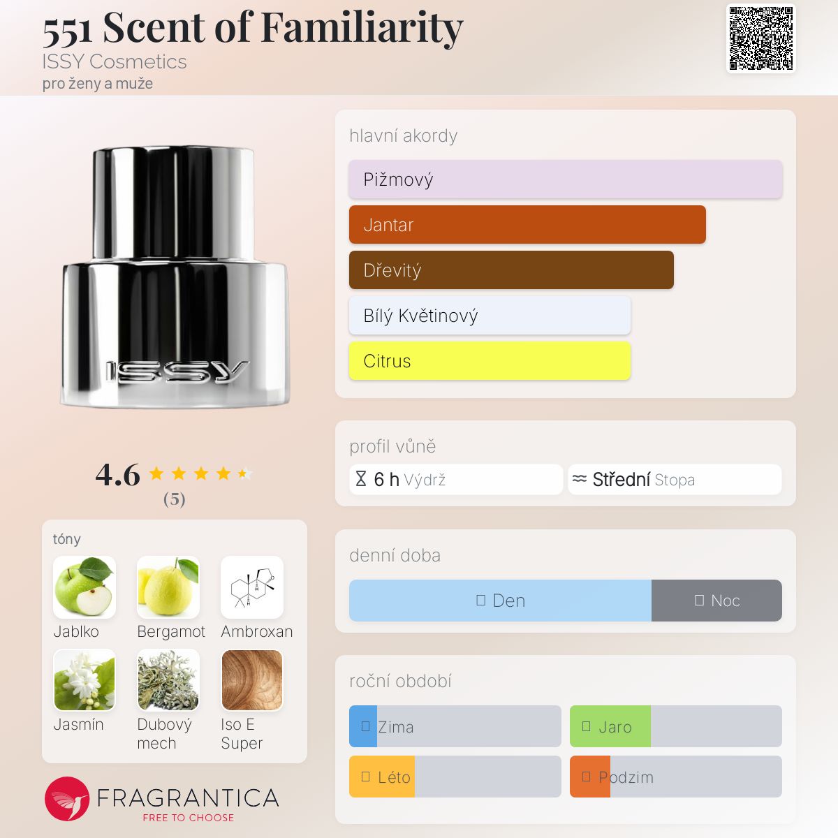551 Scent of Familiarity podle ISSY Cosmetics je vůně pro ženy a muže. Vrchní tóny jsou Zelené jablko a Bergamot; střední tóny jsouAmbroxan, Jasmín a Mech ; základní tóny jsou Iso E Super a Pižmo.