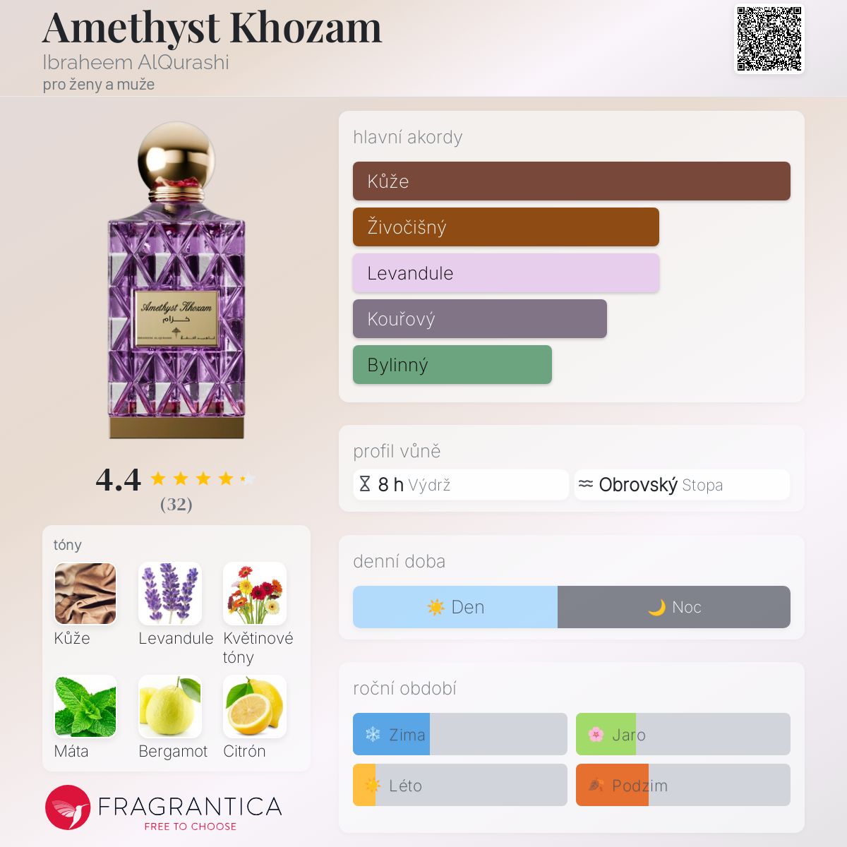 Amethyst Khozam podle Ibraheem AlQurashi je Aromatic Fougere vůně pro ženy a muže. Amethyst Khozam byl/a uveden/a v roce 2017. Vrchní tóny jsou Levandule a Květinové tóny; střední tóny jsouKůže a Máta ; základní tóny jsou Bergamot a Citrón.