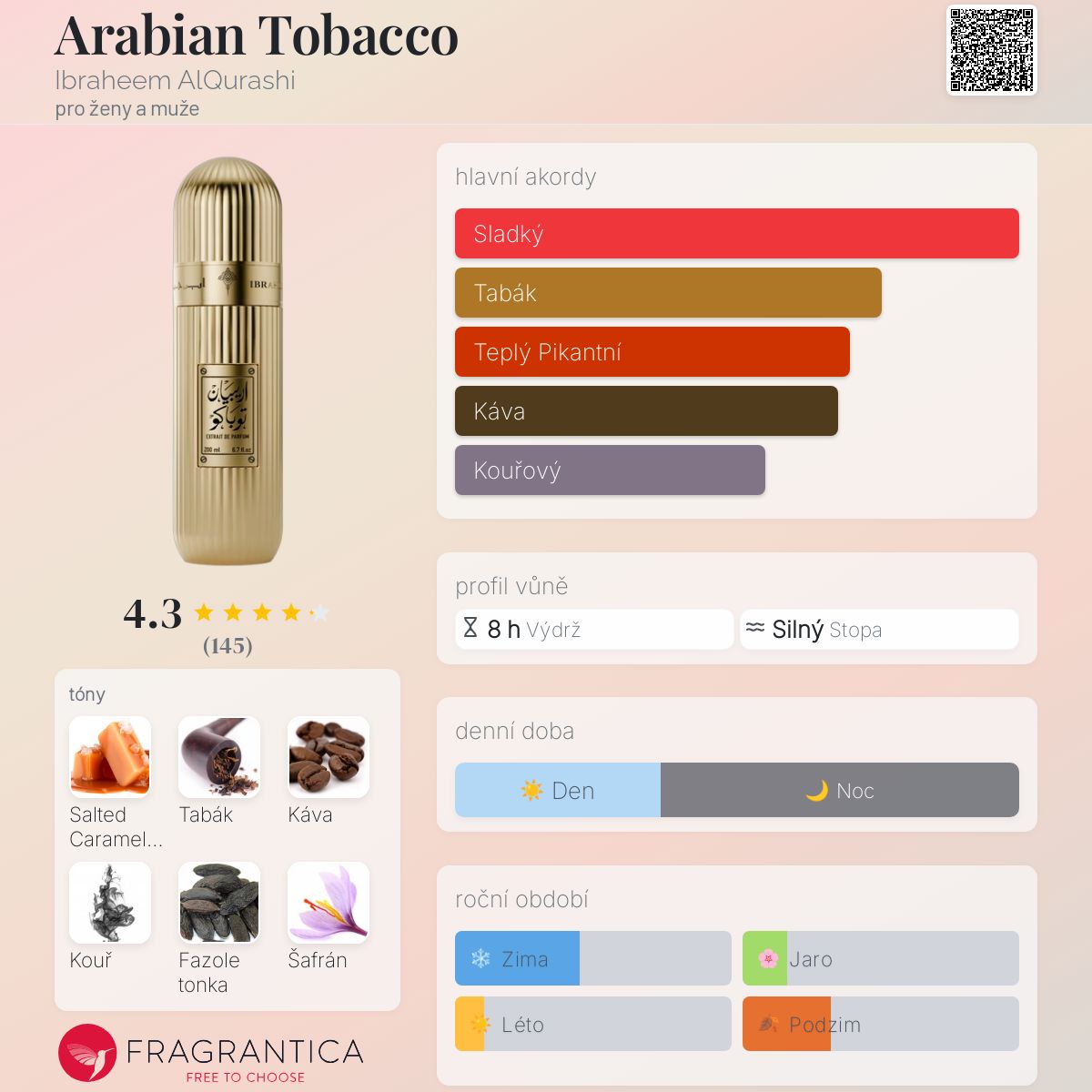 Arabian Tobacco podle Ibraheem AlQurashi je Orientální vůně pro ženy a muže. Arabian Tobacco byl/a uveden/a v roce 2023. Vrchní tóny jsou Tabák, Šafrán a Kosatec; střední tóny jsouSlaný karamelový fondán, Fazole tonka a Růže ; základní tóny jsou Káva, Kouř, Jantar (ambra), Pačuli a Pižmo.