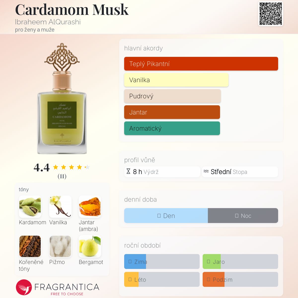 Cardamom Musk podle Ibraheem AlQurashi je Orientální Spicy vůně pro ženy a muže. Cardamom Musk byl/a uveden/a v roce 2016. Vrchní tóny jsou Vanilka a Jantar (ambra); střední tóny jsouKořeněné tóny a Bergamot ; základní tóny jsou Kardamom a Pižmo.