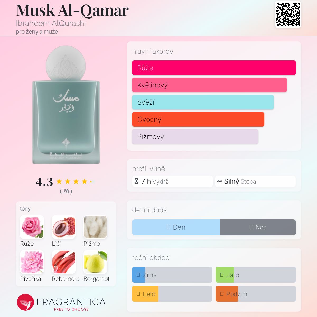 Musk Al-Qamar podle Ibraheem AlQurashi je Floral Fruity vůně pro ženy a muže. Toto je nová vůně. Musk Al-Qamar byl/a uveden/a v roce 2024. Vrchní tóny jsou Liči, Rebarbora, Bergamot a Muškátový oříšek; střední tóny jsouTurecká růže, Pižmo, Pivoňka, Petalia a Vanilka ; základní tóny jsou Cedr, Kadidlo, Kašmír a Haitský vetiver.