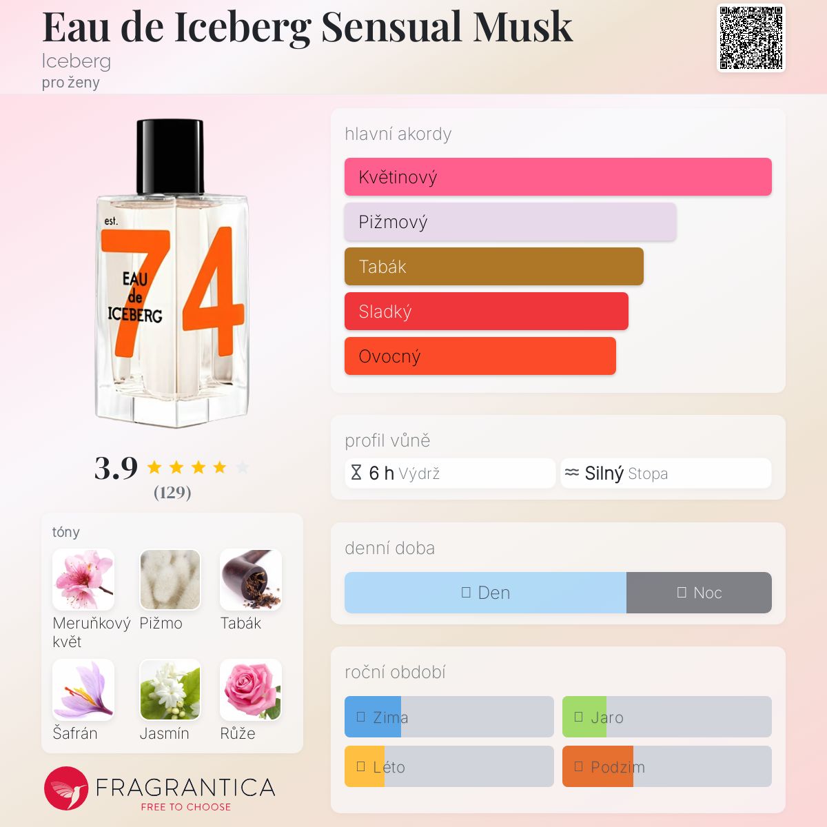 Eau de Iceberg Sensual Musk podle Iceberg je Floral Woody Musk vůně pro ženy. Eau de Iceberg Sensual Musk byl/a uveden/a v roce 2013. Vrchní tóny jsou Meruňkový květ a Šafrán; střední tóny jsouJasmín a Růže ; základní tóny jsou Pižmo a Tabák.