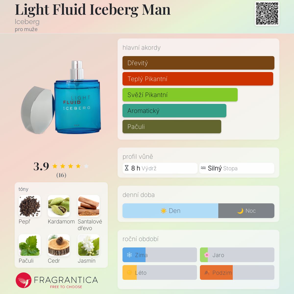 Light Fluid Iceberg Man podle Iceberg je Orientální Spicy vůně pro muže. Light Fluid Iceberg Man byl/a uveden/a v roce 2004. Vrchní tóny jsou Yuzu a Bergamot; střední tóny jsouPepř, Kardamom, Jasmín a Kasie ; základní tóny jsou Santalové dřevo, Pačuli a Cedr.