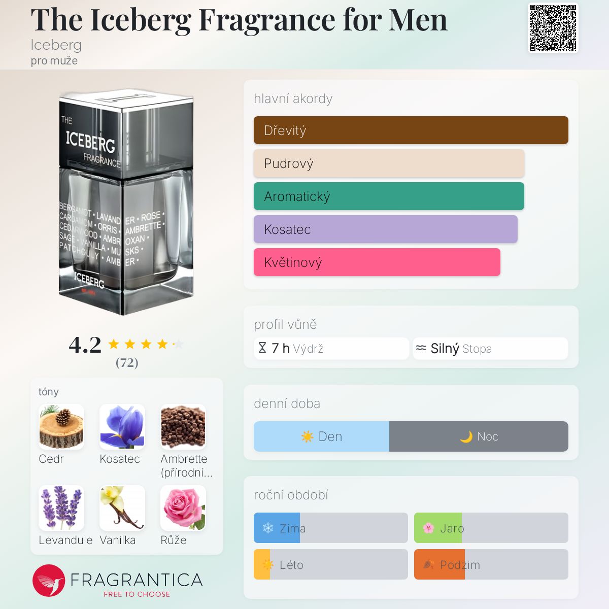 The Iceberg Fragrance for Men podle Iceberg je Woody Aromatic vůně pro muže. The Iceberg Fragrance for Men byl/a uveden/a v roce 2009. "Nosem" za touto vůní je Antoine Maisondieu. Vrchní tóny jsou Levandule, Kardamom a Bergamot; střední tóny jsouVirginský cedr, Kosatec, Ambrette (přírodní pižmo) a Růže ; základní tóny jsou Vanilka a Šalvěj.
