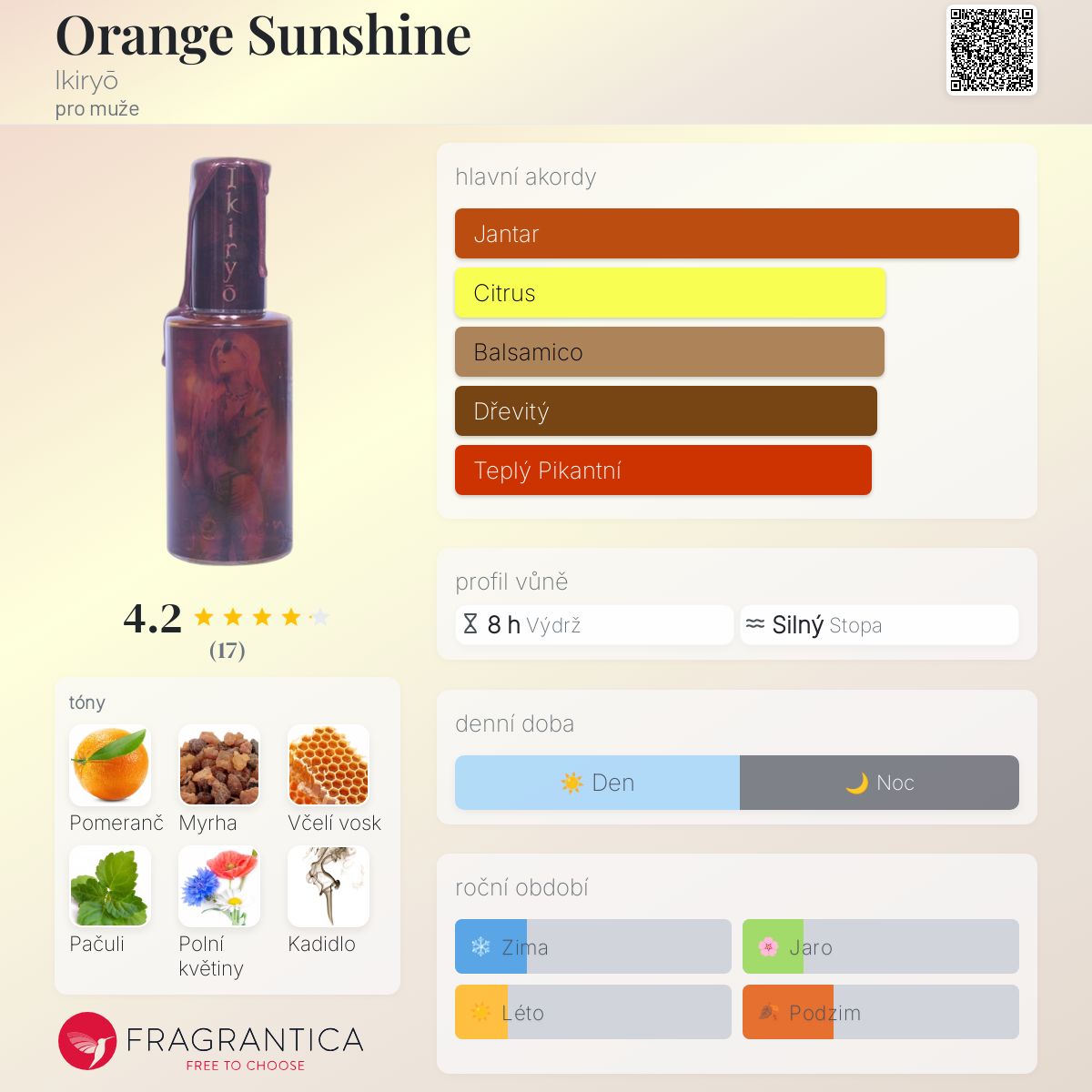 Orange Sunshine podle Ikiryō je Orientální vůně pro muže. Orange Sunshine byl/a uveden/a v roce 2017. "Nosem" za touto vůní je Vincent of Dreamhouse.