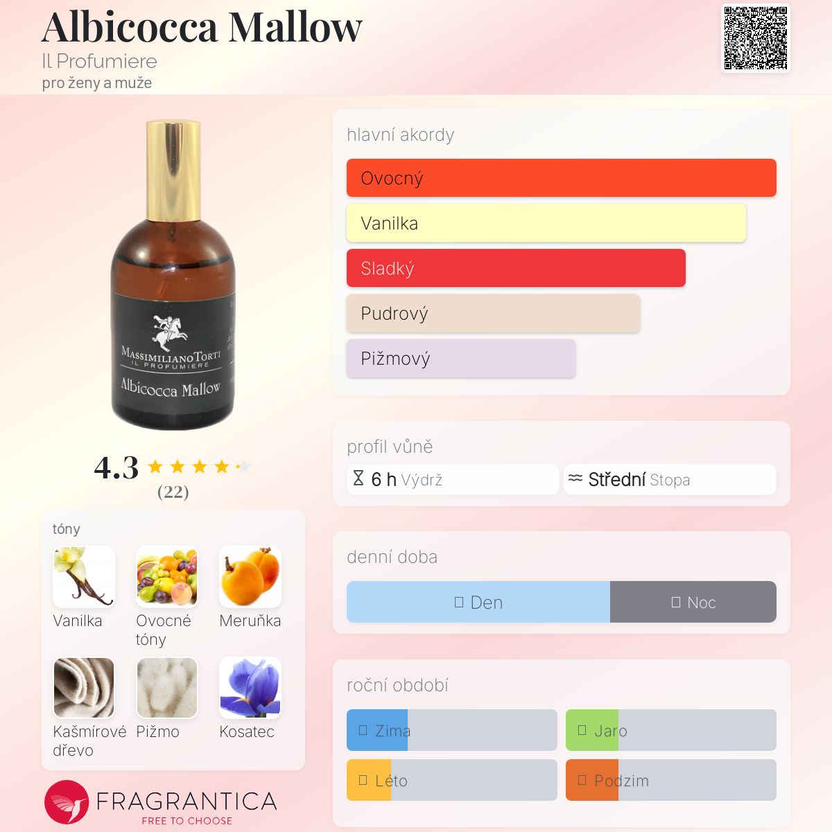 Albicocca Mallow podle Il Profumiere je vůně pro ženy a muže. Albicocca Mallow byl/a uveden/a v roce 2019. "Nosem" za touto vůní je Massimiliano Torti. Vrchní tóny jsou Ovocné tóny a Meruňka; střední tóny jsouVanilka, Kašmírové dřevo a Kosatec ; základní tón je Bílé pižmo.