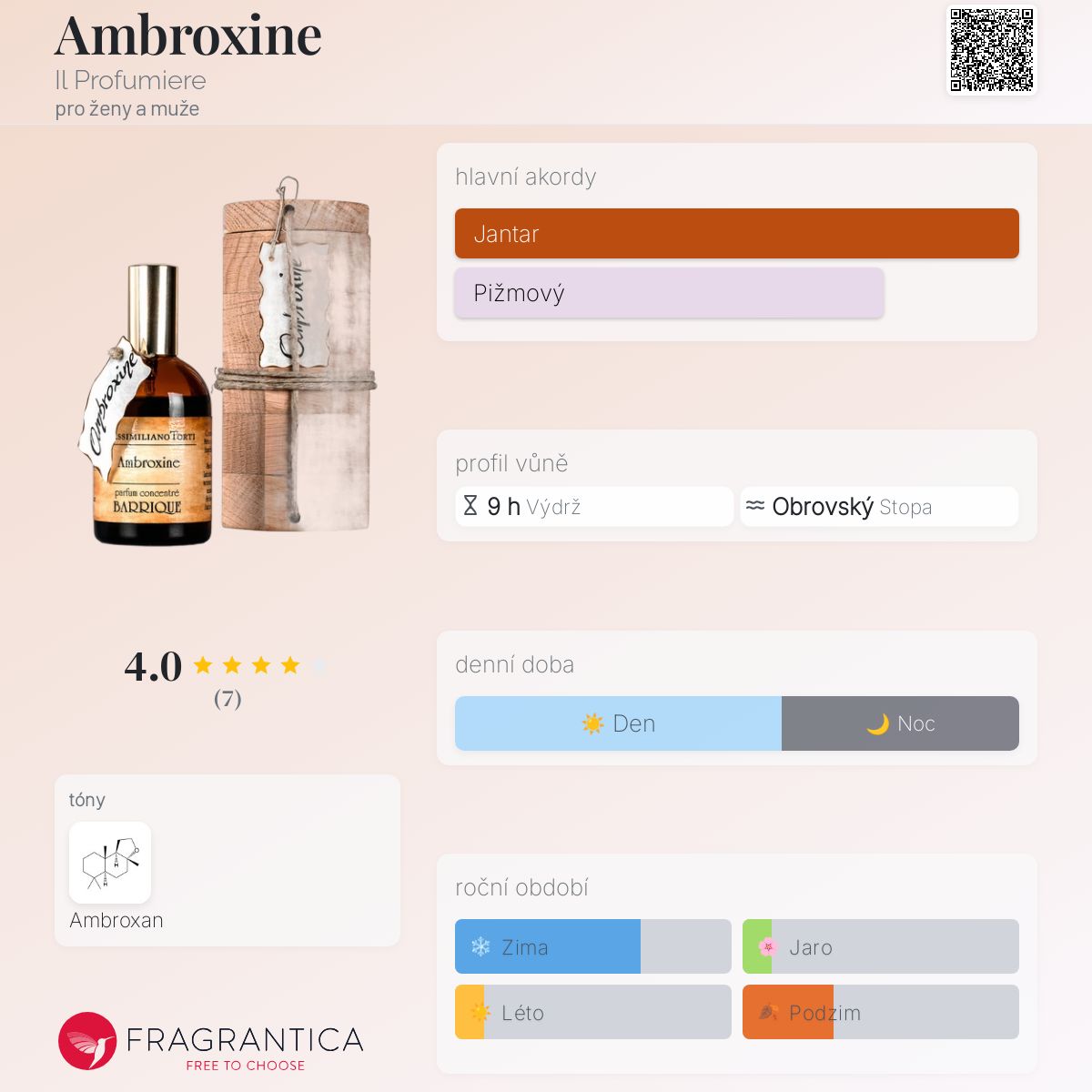 Ambroxine podle Il Profumiere je Orientální vůně pro ženy a muže. Ambroxine byl/a uveden/a v roce 2008. "Nosem" za touto vůní je Massimiliano Torti.