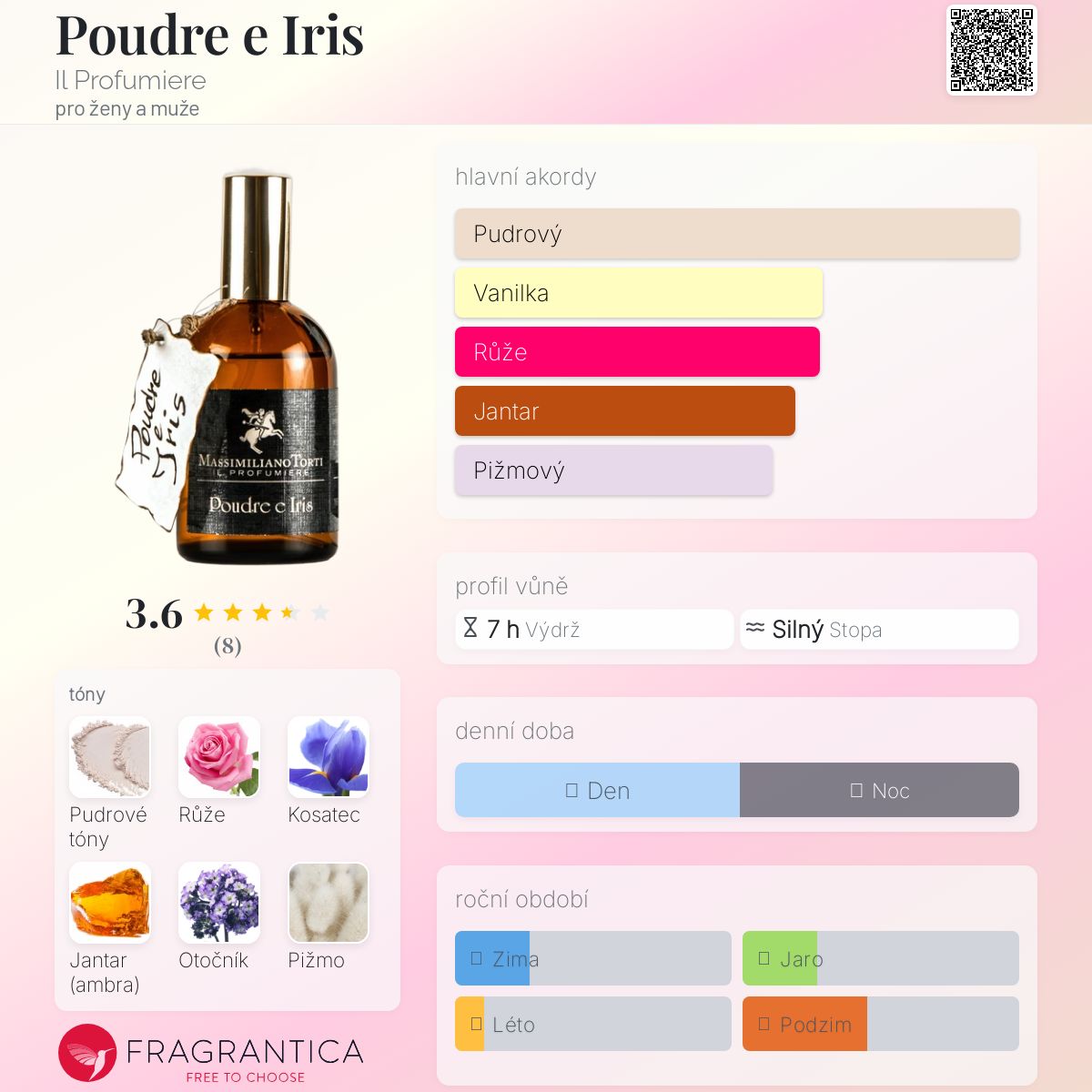 Poudre e Iris podle Il Profumiere je Floral vůně pro ženy a muže. Poudre e Iris byl/a uveden/a v roce 2008. "Nosem" za touto vůní je Massimiliano Torti.