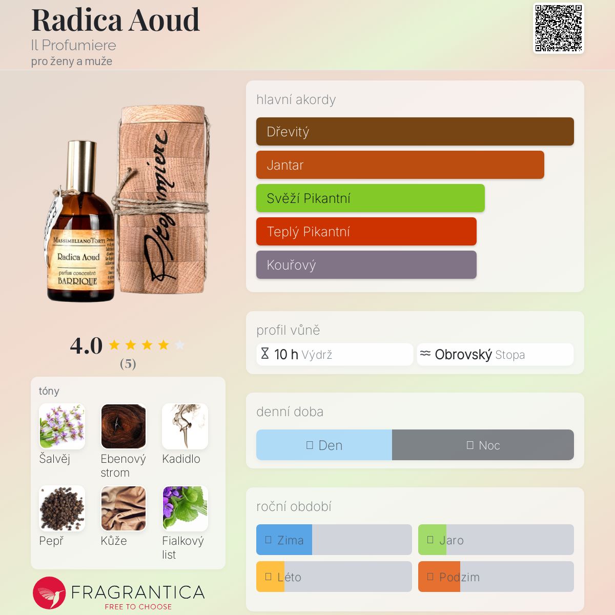 Radica Aoud podle Il Profumiere je Woody Aromatic vůně pro ženy a muže. Radica Aoud byl/a uveden/a v roce 2005. "Nosem" za touto vůní je Massimiliano Torti.