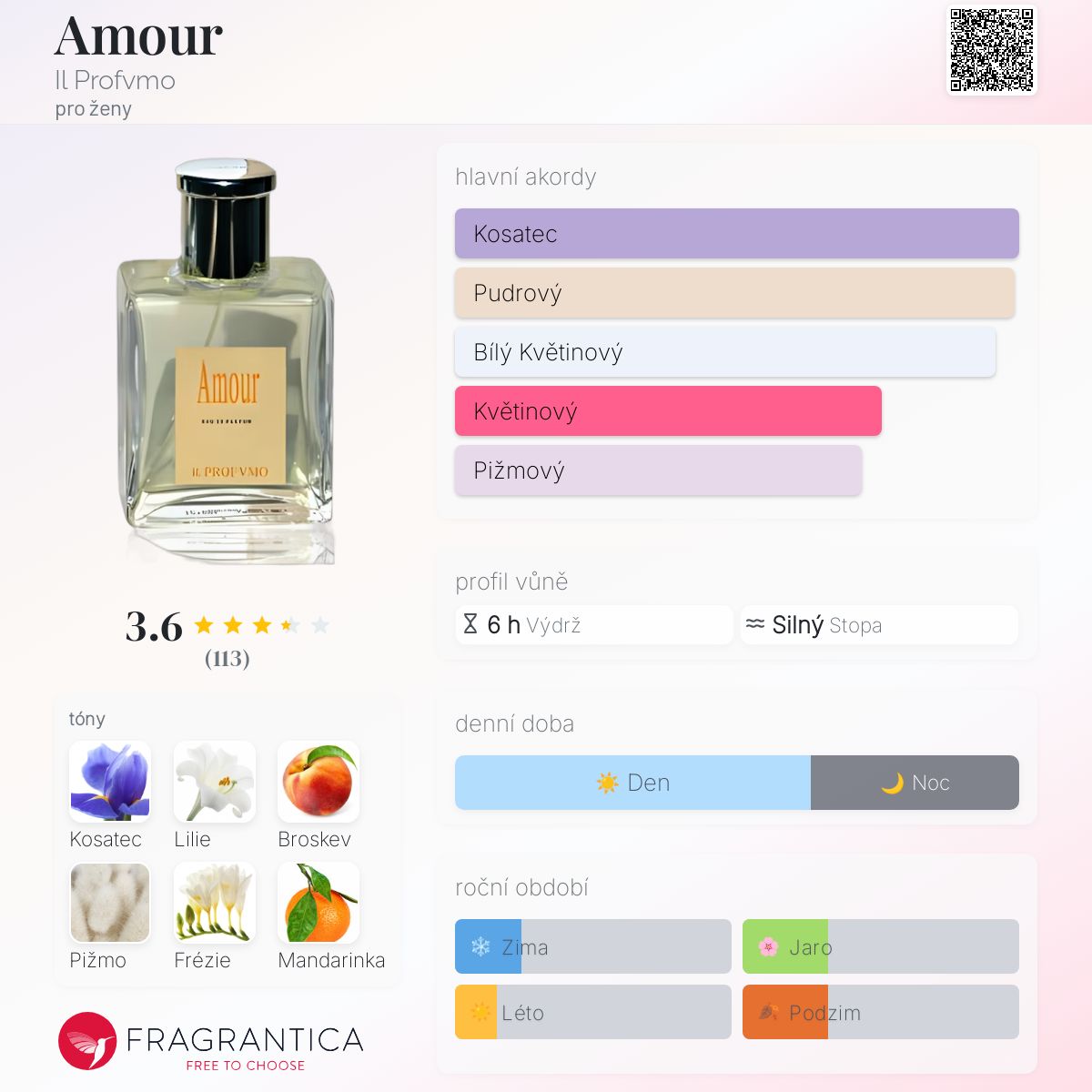 Amour podle Il Profvmo je Floral vůně pro ženy. Vrchní tóny jsou Broskev a Mandarinka; střední tóny jsouKosatec, Lilie, Frézie a Konvalinka ; základní tón je Pižmo.