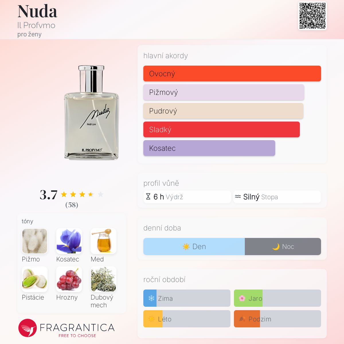 Nuda podle Il Profvmo je Floral Fruity Gourmand vůně pro ženy. Nuda byl/a uveden/a v roce 2010. Vrchní tóny jsou Hrozny, Ostružina a Červené bobule; střední tóny jsouKosatec, Med, Broskev a Zázvor ; základní tóny jsou Pižmo, Pistácie, Dubový mech a Konopí.