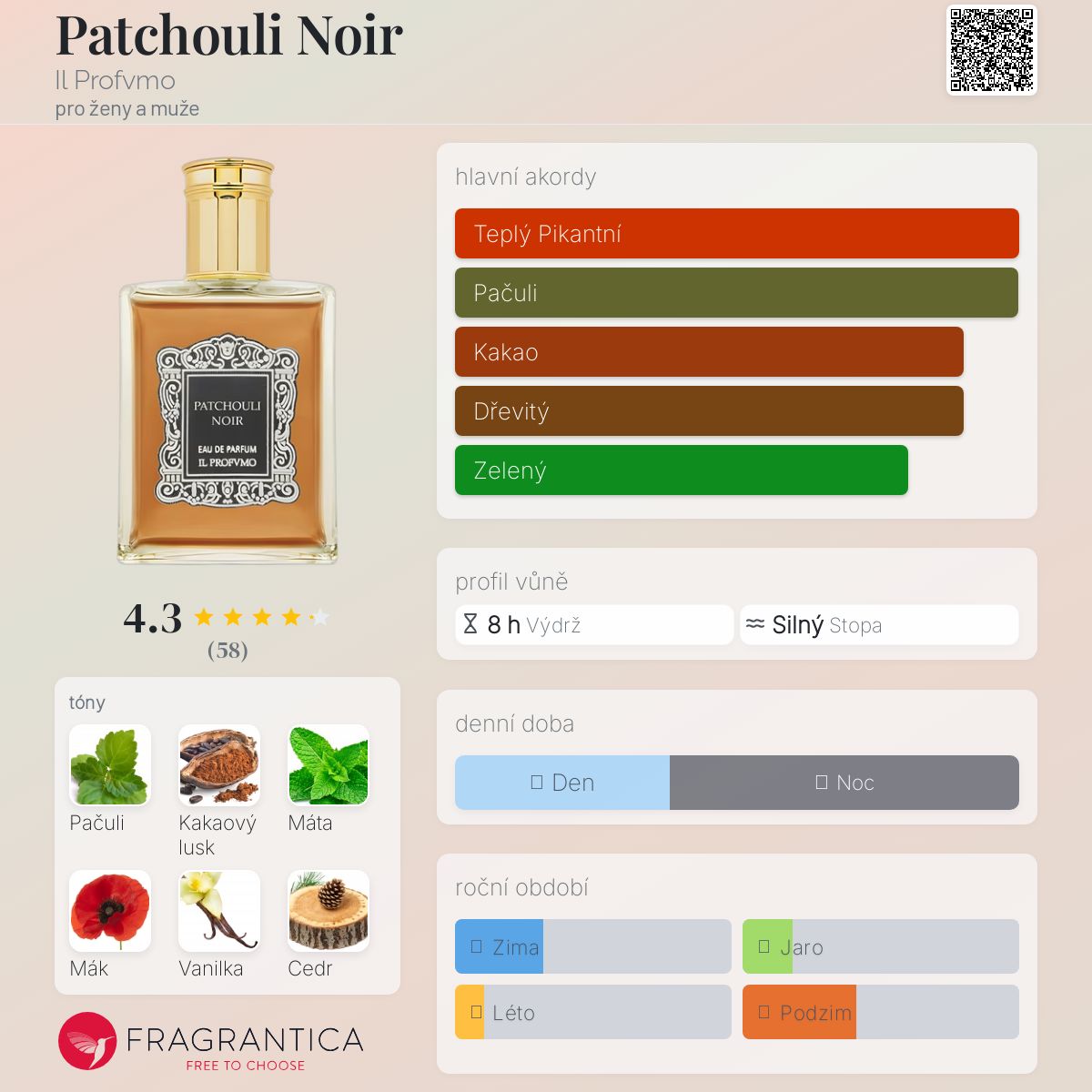 Patchouli Noir podle Il Profvmo je Orientální Woody vůně pro ženy a muže. Patchouli Noir byl/a uveden/a v roce 2006. "Nosem" za touto vůní je Silvana Casoli. Vrchní tón je Máta ; střední tóny jsouPačuli, Mák a Cedr ; základní tóny jsou Kakao a Vanilka.