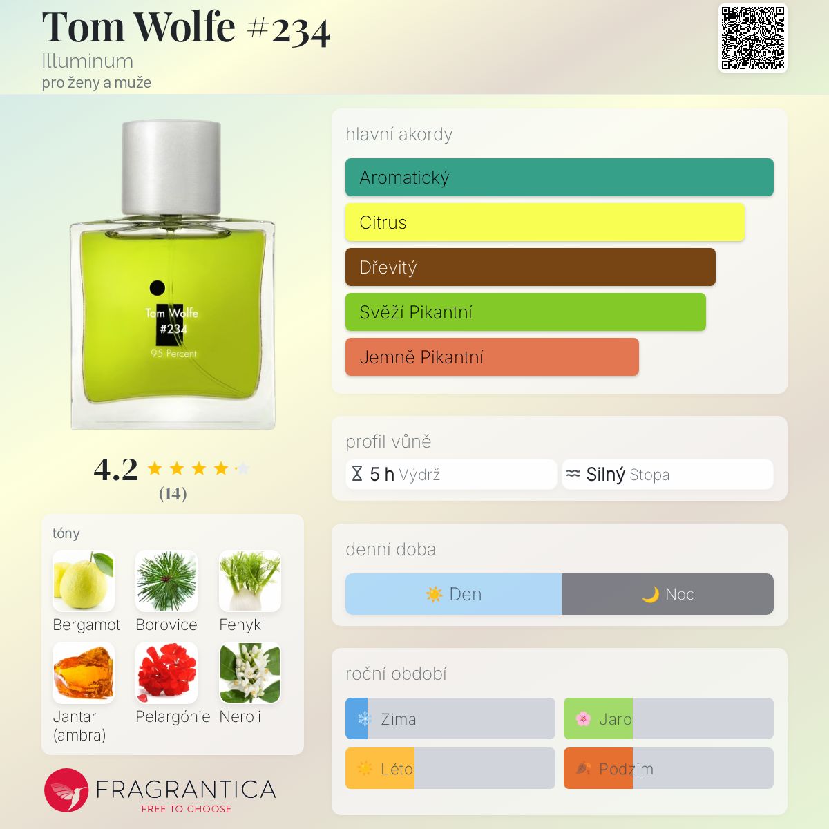 Tom Wolfe #234 podle Illuminum je Woody Aromatic vůně pro ženy a muže. Tom Wolfe #234 byl/a uveden/a v roce 2016. Vrchní tóny jsou Bergamot a Fenykl; střední tóny jsouPelargónie a Neroli ; základní tóny jsou Borovice a Jantar (ambra).
