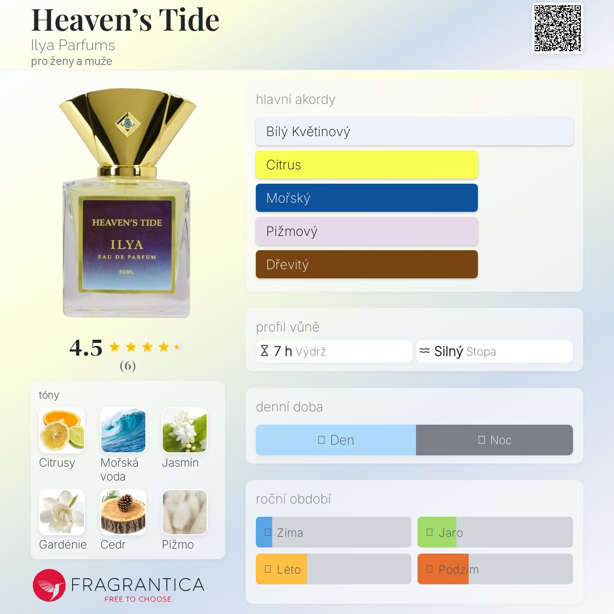 Heaven’s Tide podle Ilya Parfums je Floral Aquatic vůně pro ženy a muže. Heaven’s Tide byl/a uveden/a v roce 2023. "Nosem" za touto vůní je Ilyas Kakis. Vrchní tóny jsou Citrusy a Mořské tóny; střední tóny jsouJasmín a Gardénie ; základní tóny jsou Cedr a Pižmo.