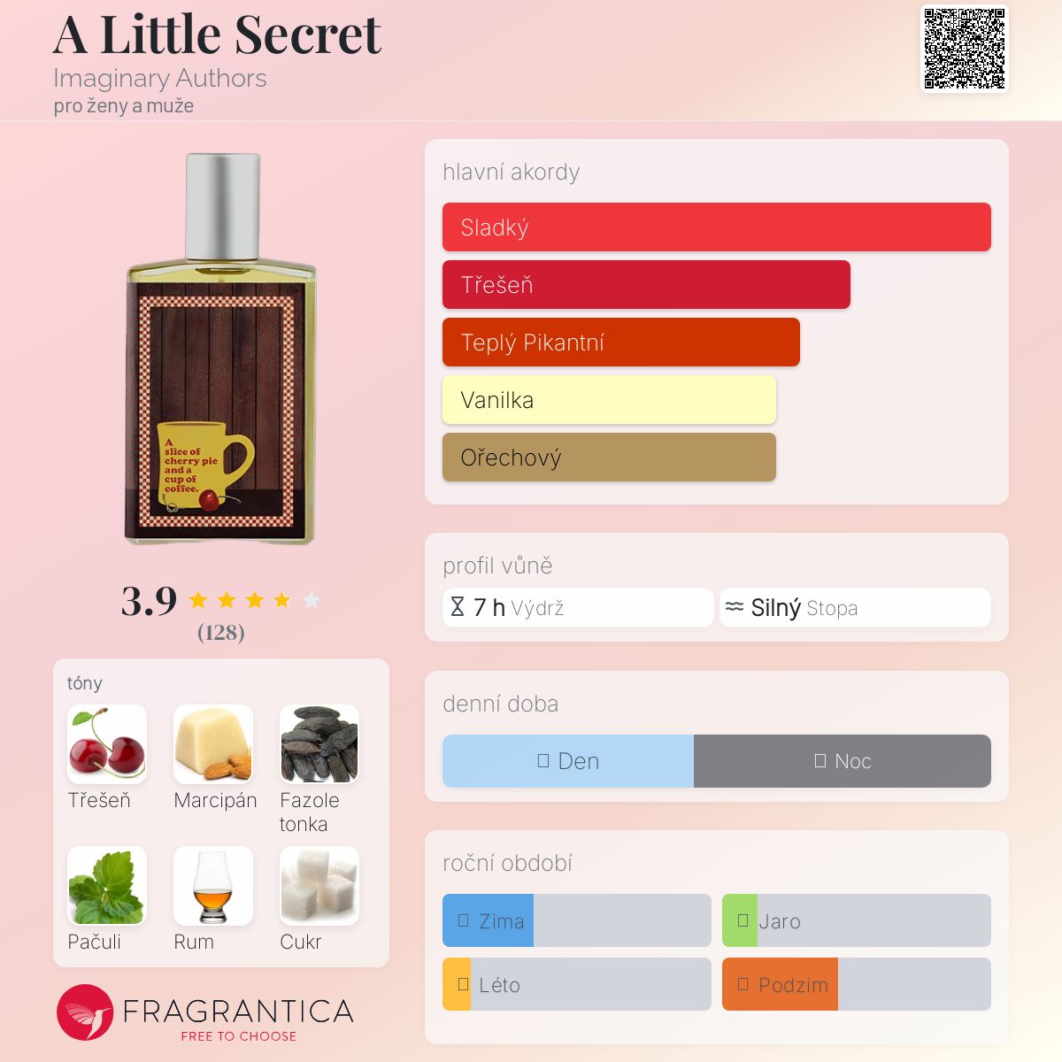 A Little Secret podle Imaginary Authors je Orientální Vanilla vůně pro ženy a muže. Toto je nová vůně. A Little Secret byl/a uveden/a v roce 2025. Vrchní tóny jsou Třešeň a Šafrán; střední tóny jsouMarcipán, Cukr a Listové těsto ; základní tóny jsou Fazole tonka, Pačuli a Rum.