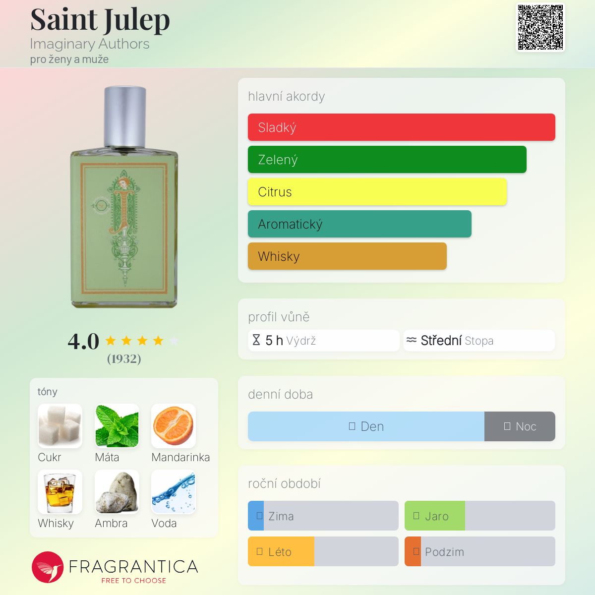 Saint Julep je krásný. Máta je zde dominantní a je dokonale zpracovaná, žádná zubní pasta, žádný mátový nesmysl. Díky přídavku cukru a mandarinky a špetce bourbonu je nos tak velmi příjemný. Dobře se promítá a vydrží mi kolem šesti hodin. Saint Julep je skvělým doplňkem řady Imaginary Authors, protože se snadno nosí, je příjemná a velmi univerzální. Velmi dobře ji cítím i v podzimních mrazech. Plná lahvička stojí za to, určitě do ní investuji na jaro a léto příštího roku.