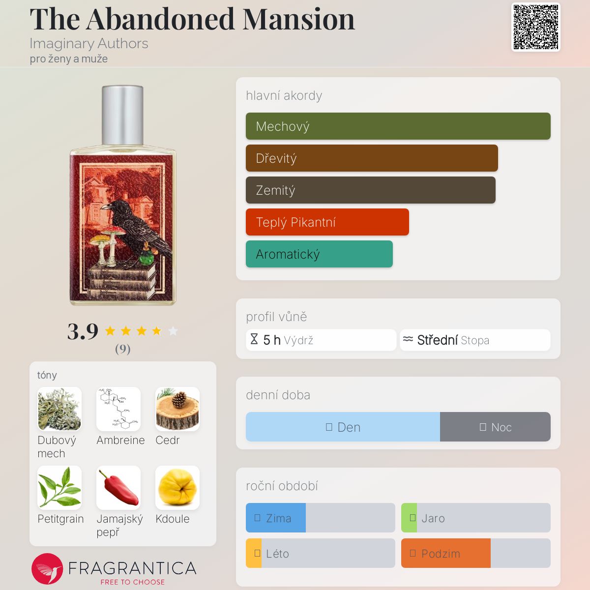 The Abandoned Mansion podle Imaginary Authors je Woody Spicy vůně pro ženy a muže. Toto je nová vůně. The Abandoned Mansion byl/a uveden/a v roce 2025. Vrchní tóny jsou Cedr, Petitgrain a Kdoule; střední tón jeJamajský pepř ; základní tóny jsou Dubový mech a Ambreine.