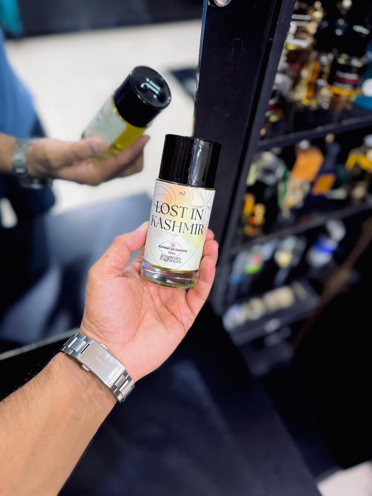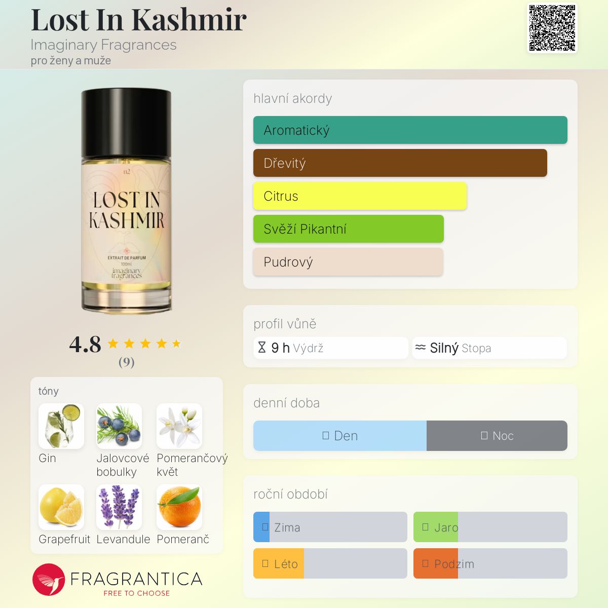 Lost In Kashmir podle Imaginary Fragrances je Aromatic vůně pro ženy a muže. Toto je nová vůně. Lost In Kashmir byl/a uveden/a v roce 2024. "Nosem" za touto vůní je Sachin Singh. Vrchní tóny jsou Gin, Jalovcové bobulky, Pomerančový květ, Grapefruit, Levandule, Pomeranč a Elimi; střední tóny jsouKořen orris, Cedr, Rozmarýn, Jasmín, Ovoce a Citrusy ; základní tóny jsou Palisandr, Otočník, Skořice, Vanilka, Jantar (ambra), Pižmo, Fazole tonka a Iso E Super.