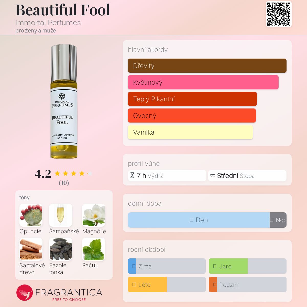 Beautiful Fool podle Immortal Perfumes je Woody Aromatic vůně pro ženy a muže. Beautiful Fool byl/a uveden/a v roce 2022. "Nosem" za touto vůní je JT Siems. Vrchní tóny jsou Opuncie, Magnólie a Slunečnice; střední tóny jsouŠampaňské a Tabák ; základní tóny jsou Santalové dřevo, Fazole tonka, Pačuli a Vanilka.
