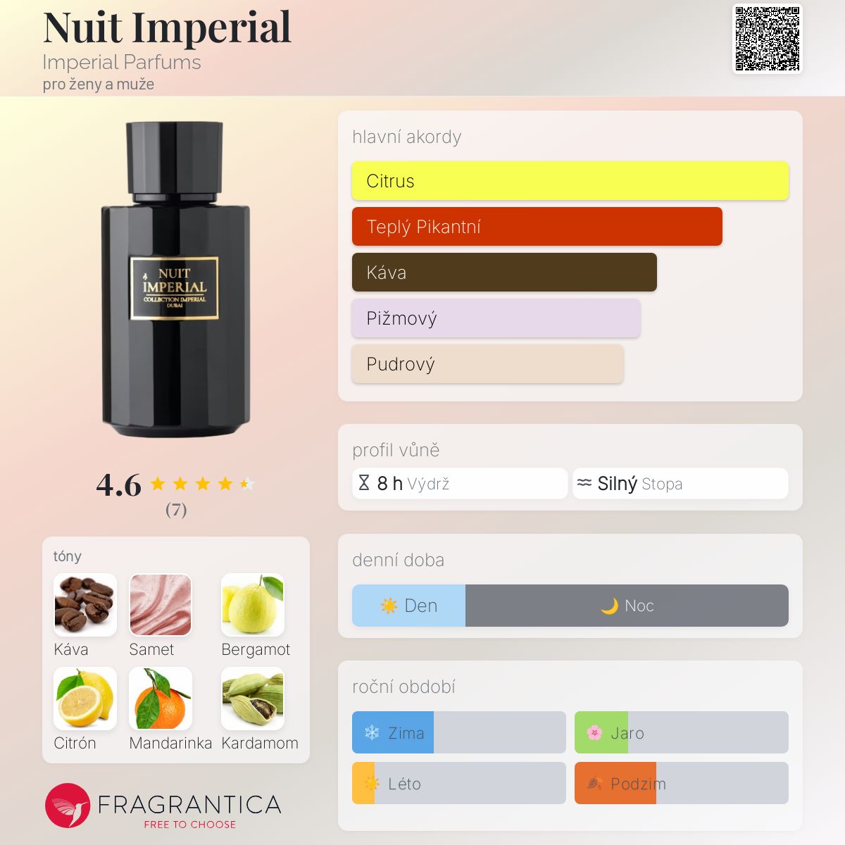 Nuit Imperial podle Imperial Parfums je vůně pro ženy a muže. Nuit Imperial byl/a uveden/a v roce 2023. Vrchní tóny jsou Káva, Bergamot, Italský citrón a Mandarinka; střední tóny jsouSamet, Kardamom, Santalové dřevo, Pačuli a Růže ; základní tóny jsou Čokoláda, Pomeranč, Jantar (ambra) a Pižmo.