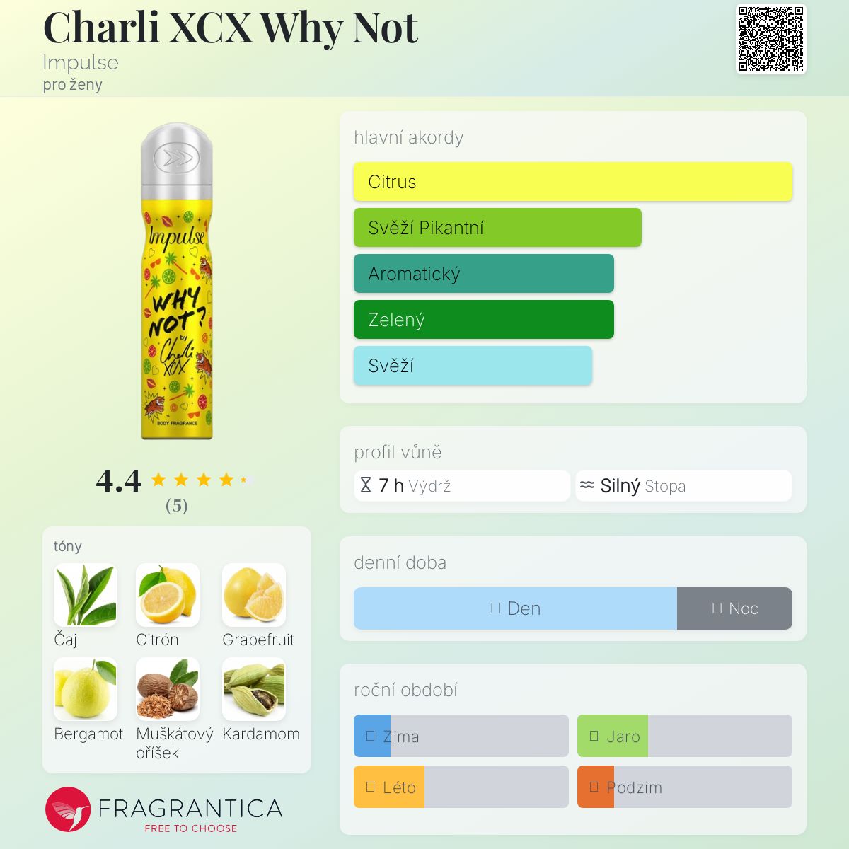 Charli XCX Why Not podle Impulse je Citrus Aromatic vůně pro ženy. Charli XCX Why Not byl/a uveden/a v roce 2016.