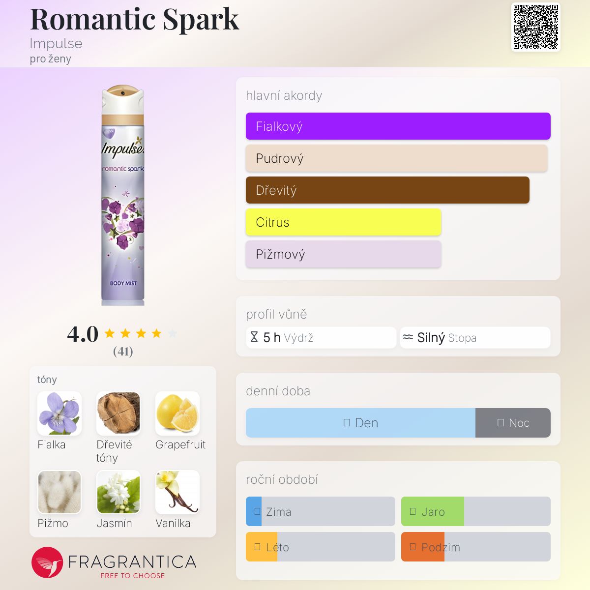 Romantic Spark podle Impulse je Floral Woody Musk vůně pro ženy. Romantic Spark byl/a uveden/a v roce 2009. "Nosem" za touto vůní je Ann Gottlieb.