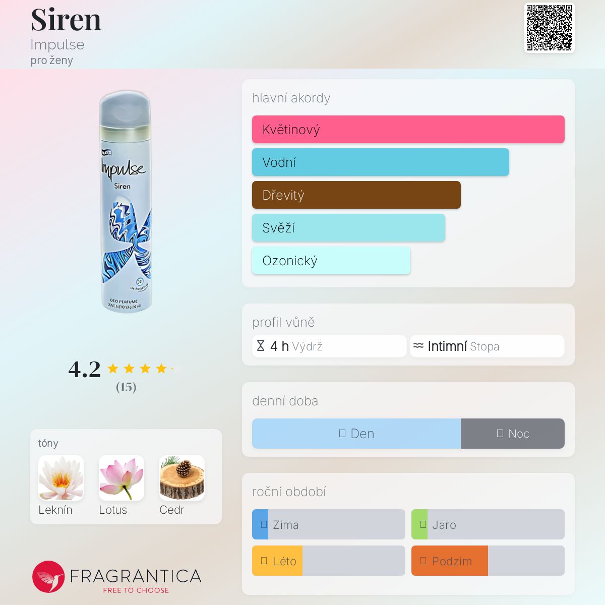 Siren podle Impulse je Floral Aquatic vůně pro ženy. Siren byl/a uveden/a v roce 2003. "Nosem" za touto vůní je Ann Gottlieb.