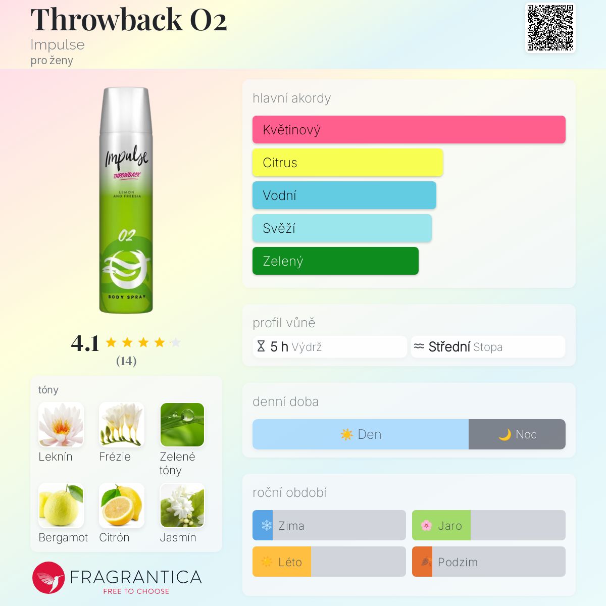 Throwback O2 podle Impulse je Floral vůně pro ženy. Throwback O2 byl/a uveden/a v roce 2023. Vrchní tóny jsou Zelené tóny, Bergamot a Citrón; střední tóny jsouLeknín, Frézie a Jasmín ; základní tóny jsou Cedr, Jantar (ambra) a Pižmo.