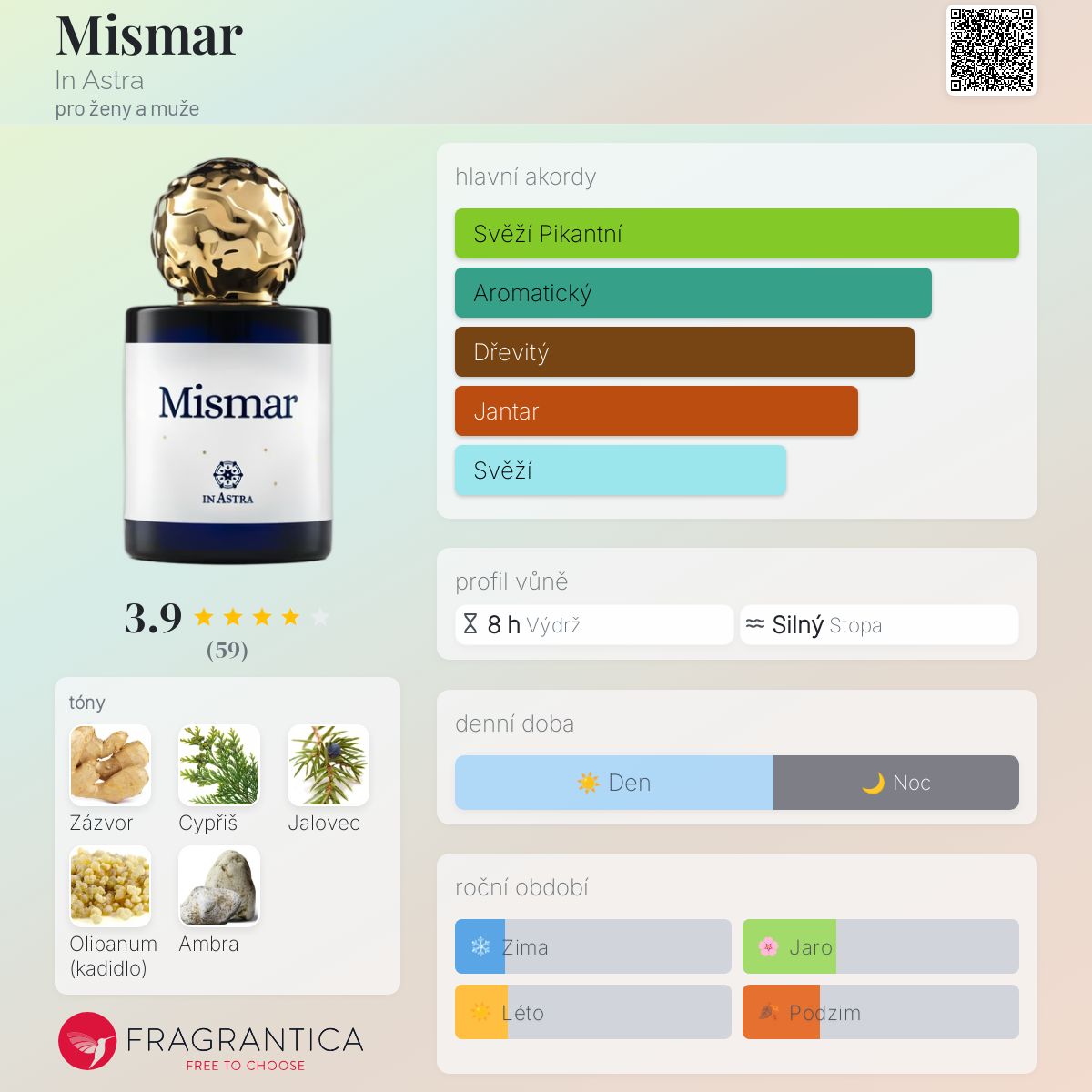 Mismar podle In Astra je Woody Aromatic vůně pro ženy a muže. Mismar byl/a uveden/a v roce 2020. "Nosem" za touto vůní je Sofia Bardelli. Vrchní tón je Jalovec ; střední tóny jsouZázvor a Cypřiš ; základní tóny jsou Olibanum a Ambra.