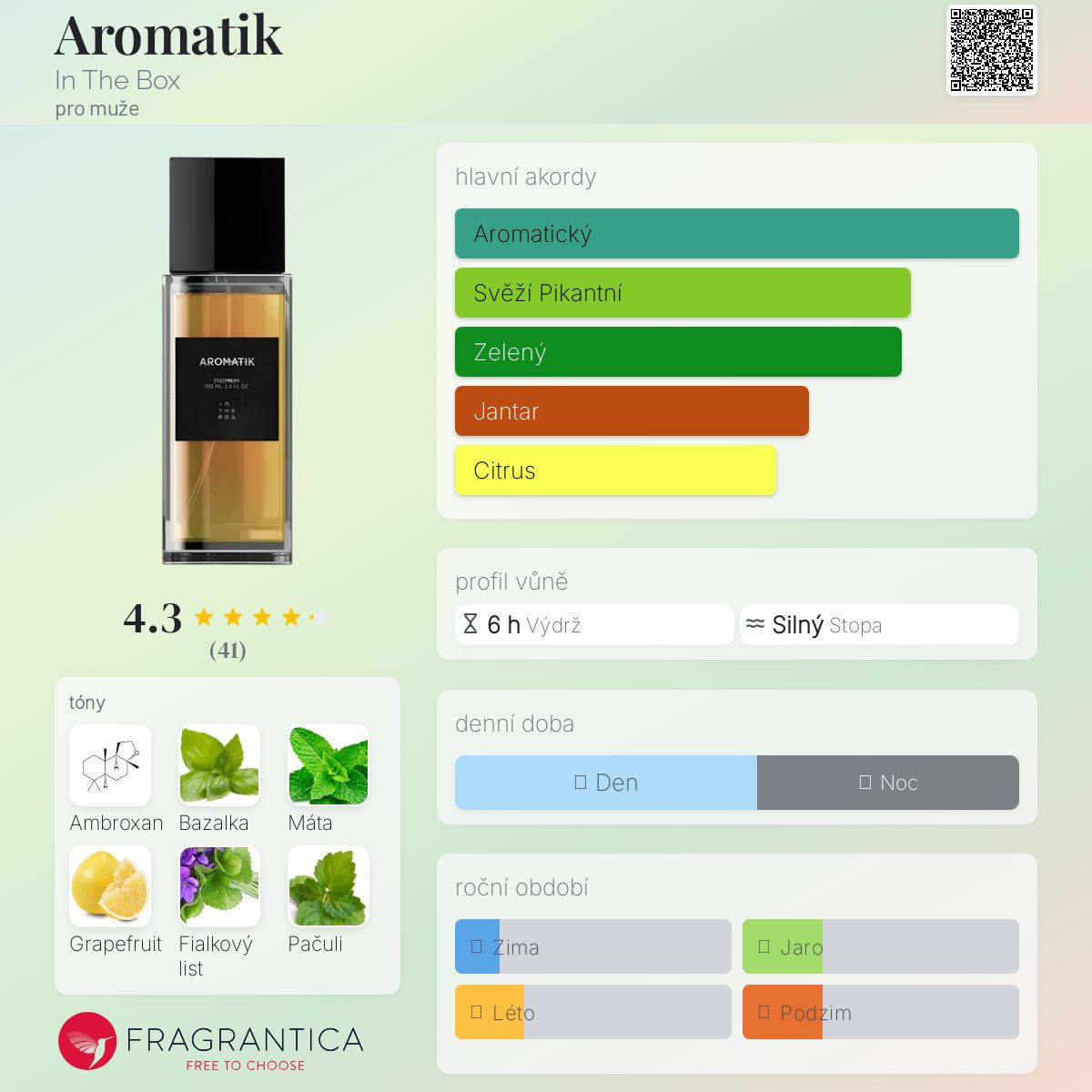 Aromatik podle In The Box je Aromatic vůně pro muže. Aromatik byl/a uveden/a v roce 2022. Vrchní tóny jsou Bazalka, Máta a Grapefruit; střední tóny jsouFialkový list, Šalvěj muškátová a Tymián ; základní tóny jsou Ambroxan, Pačuli a Vetiver.
