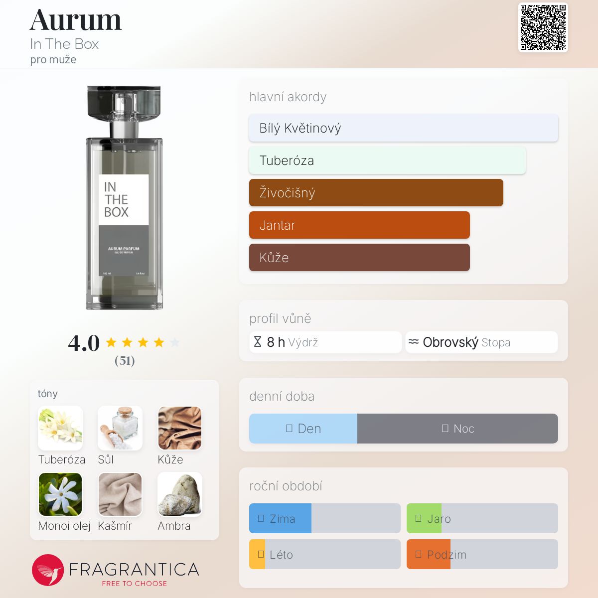 Aurum podle In The Box je Leather vůně pro muže. Aurum byl/a uveden/a v roce 2020. Vrchní tóny jsou Tuberóza, Sůl, Kašmír a Borovice; střední tón jeKůže ; základní tóny jsou Monoi olej, Ambra a Labdanum.