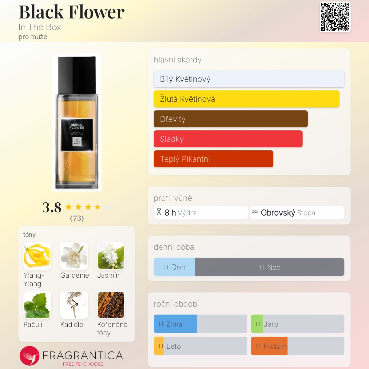 Black Flower podle In The Box je Orientální Floral vůně pro muže. Black Flower byl/a uveden/a v roce 2019. Vrchní tóny jsou Ylang-Ylang, Gardénie, Jasmín, Lanýž, Černý rybíz, Bergamot, Mandarinka a Citron amalfi; střední tóny jsouYlang-Ylang, Gardénie, Jasmín, Koření, Ovocné tóny, Orchidej a Lotus ; základní tóny jsou Pačuli, Kadidlo, Vanilka, Jantar (ambra), Santalové dřevo, Bílé pižmo, Mexická čokoláda a Vetiver.