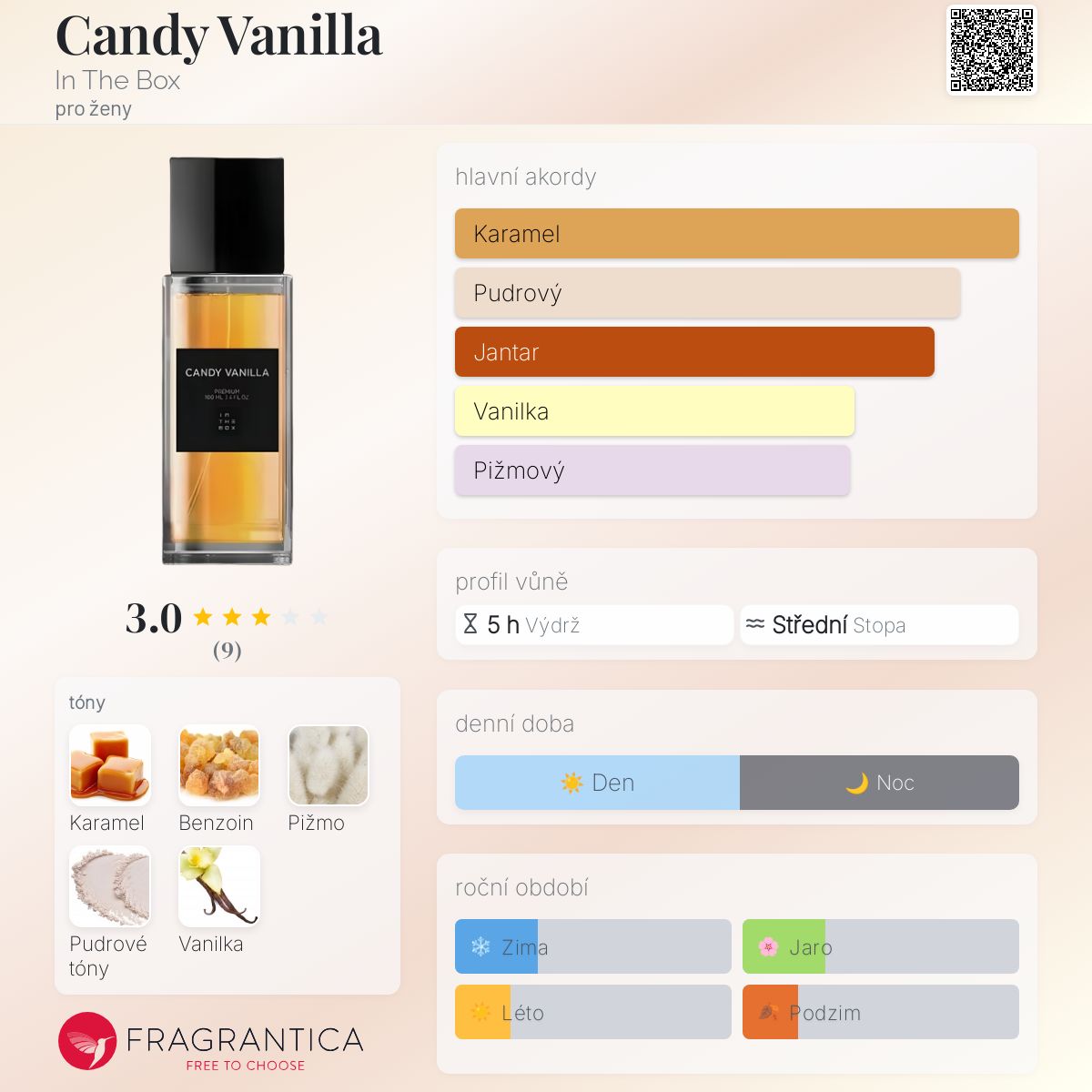 Candy Vanilla podle In The Box je Orientální Vanilla vůně pro ženy. Candy Vanilla byl/a uveden/a v roce 2018. Vrchní tón je Karamel ; střední tóny jsouPižmo a Pudrové tóny ; základní tóny jsou Benzoin a Vanilka.