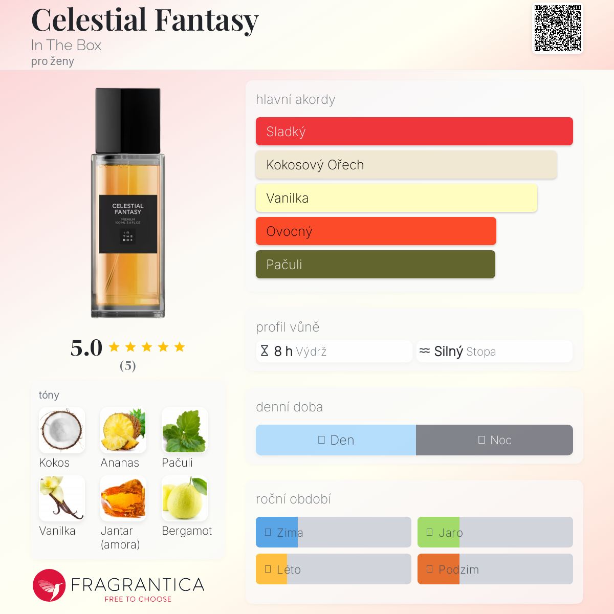 Celestial Fantasy podle In The Box je Orientální Floral vůně pro ženy. Toto je nová vůně. Celestial Fantasy byl/a uveden/a v roce 2025. Vrchní tóny jsou Ananas a Bergamot; střední tóny jsouKokos a Květ tiare ; základní tóny jsou Pačuli, Bourbonská vanilka a Jantar (ambra).