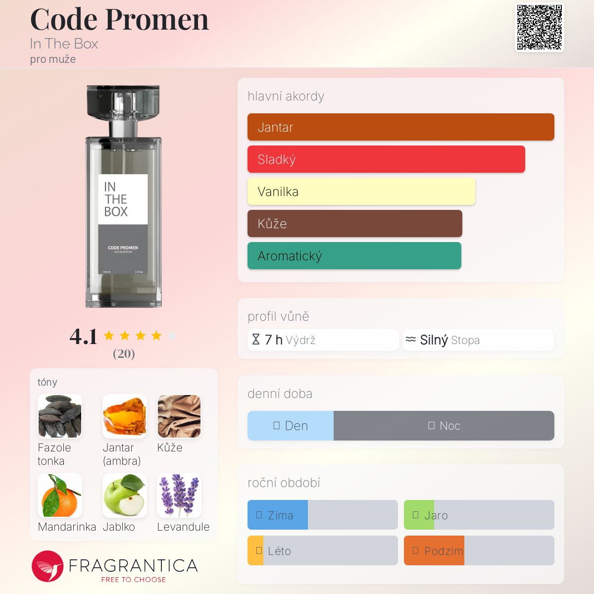 Code Promen podle In The Box je Aromatic vůně pro muže. Code Promen byl/a uveden/a v roce 2018. Vrchní tóny jsou Zelená mandarinka, Zelené jablko a Kardamom; střední tóny jsouLevandule, Muškátový oříšek a Pomerančový květ ; základní tóny jsou Fazole tonka, Jantar (ambra), Kůže, Pralinka, Tabák a Styrax.